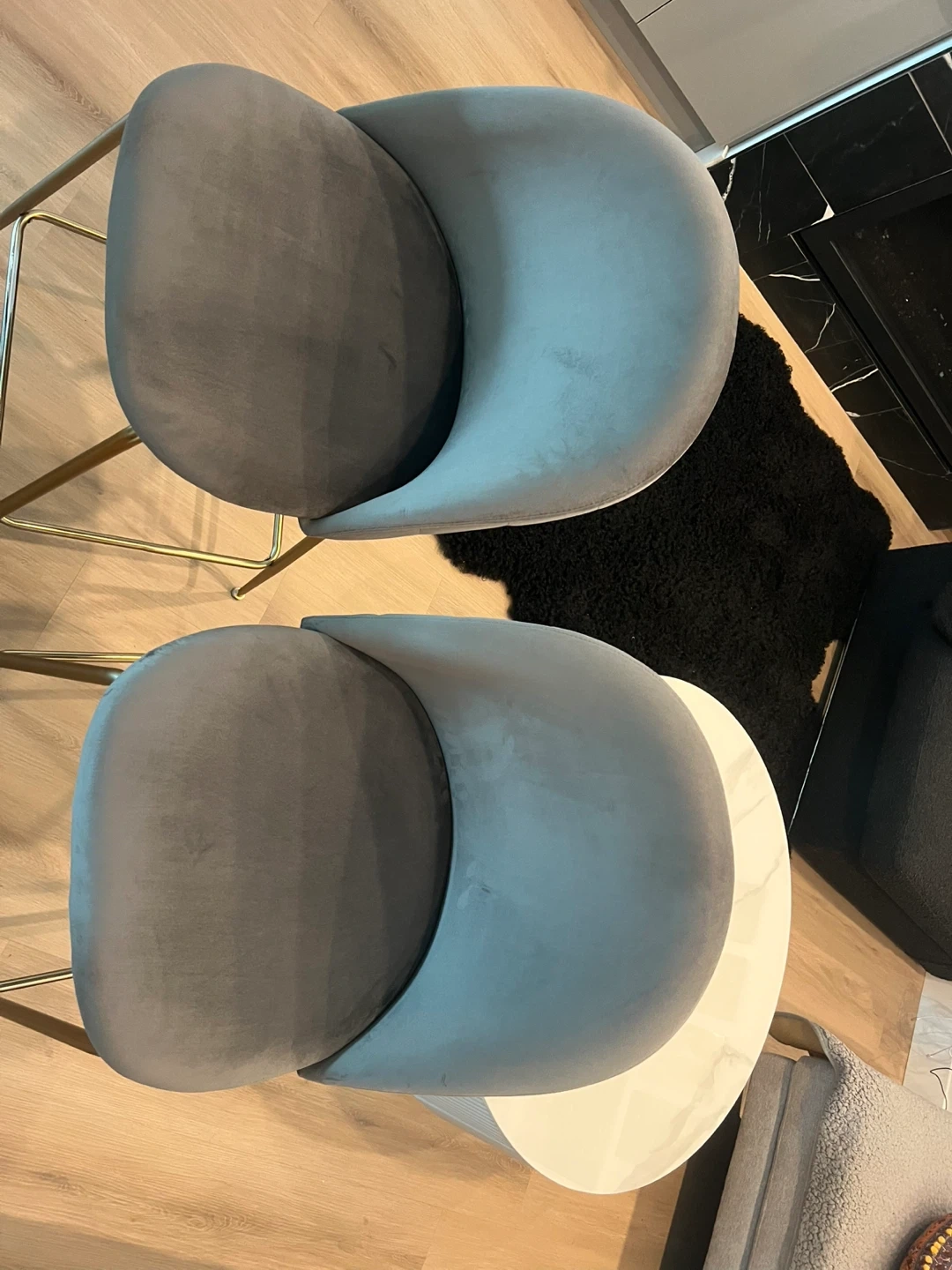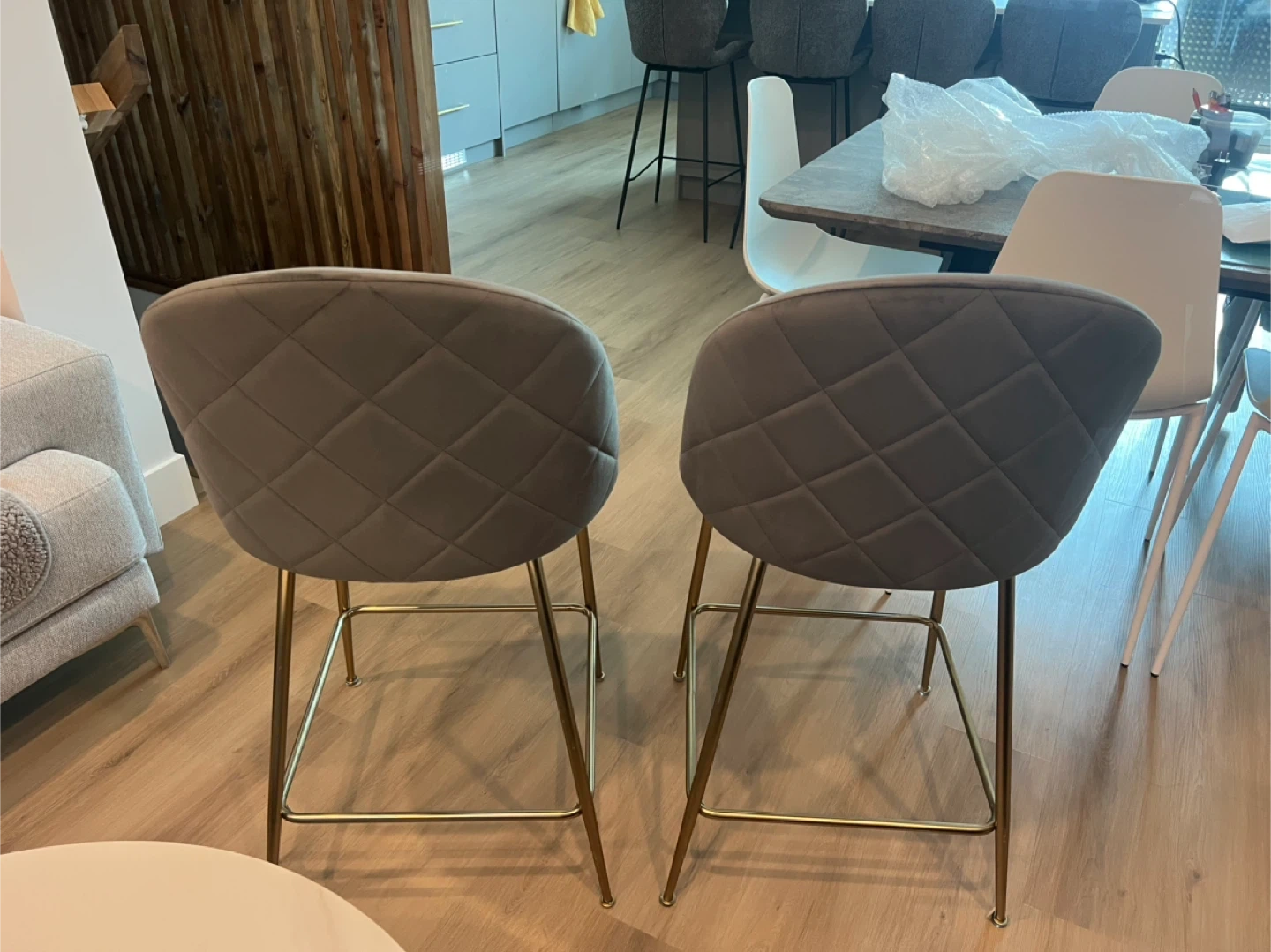 Selling a set of two bar stools. They are brand new and still in their original packaging! The stools feature a stylish grey velvet upholstery and sleek gold legs, adding a touch of elegance to any kitchen or bar area