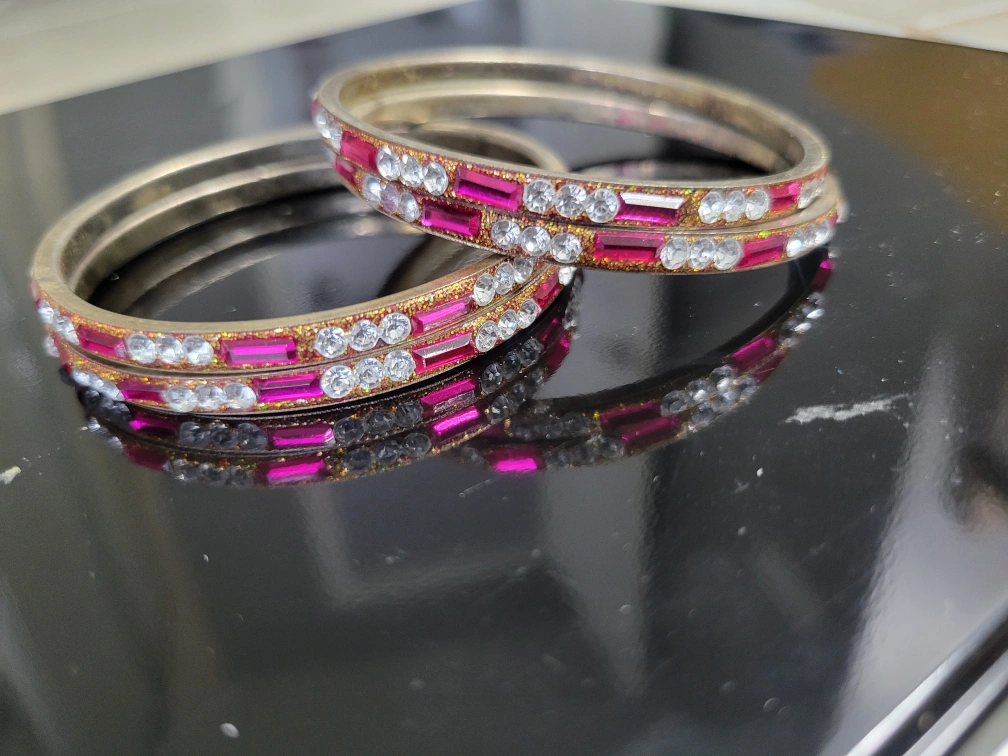 Selling a set of two lovely bangles! They're gold-toned and decorated with bright pink and clear crystals. Perfect for adding a touch of sparkle to any outfit!