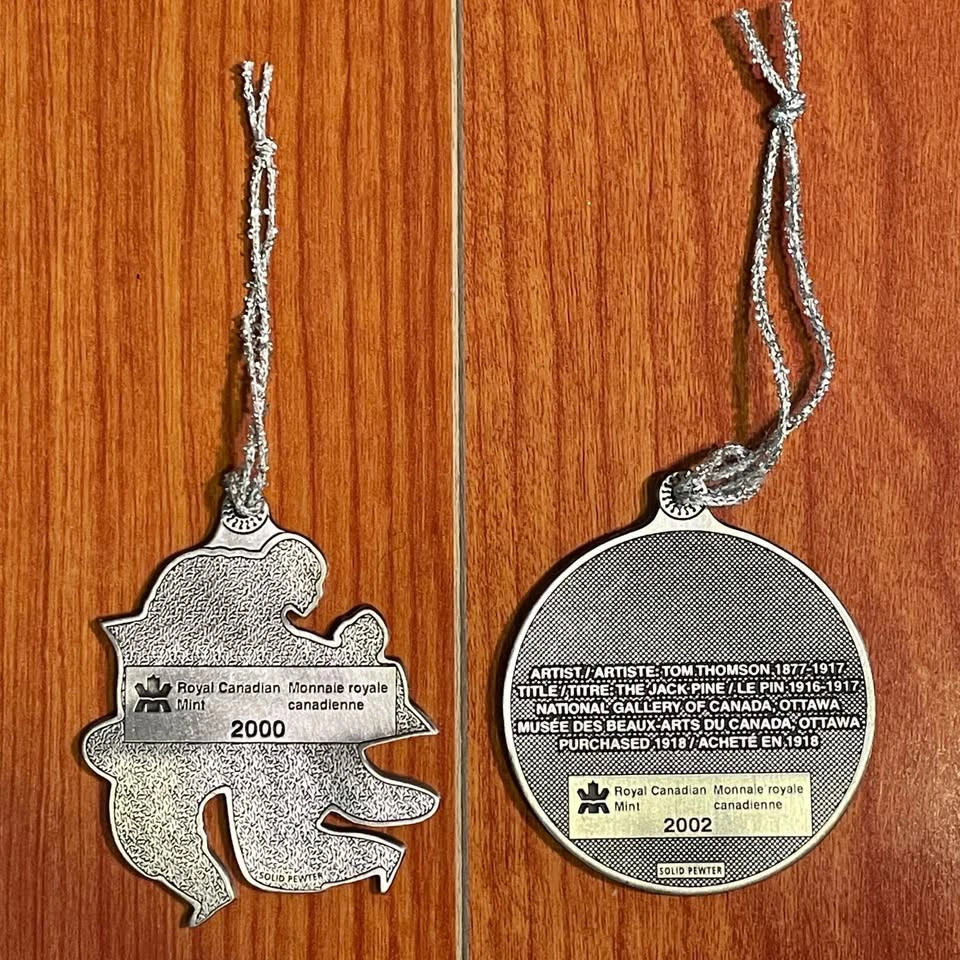 48Set of 2 Royal Canadian Mint Pewter Christmas Ornaments – “Inuit Mother and Child” (2000) & “The Jack Pine” (2002). Beautiful collectible ornaments crafted by the Royal Canadian Mint. • 2000 – Inuit Mother and Child • 2002 – The Jack Pine Each piece is made of fine pewter with exceptional craftsmanship and detail — a tribute to Canada’s rich culture and natural beauty. Perfect for collectors or adding a touch of Canadian charm to your holiday décor. Pick up at Don Mils & Steeles.