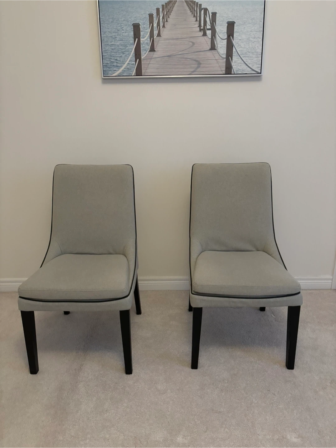 Selling a set of two upholstered dining chairs! They're in great condition and would look lovely in any dining room or kitchen. The chairs feature a neutral-toned fabric with dark wood legs, offering a modern and elegant touch to your home decor