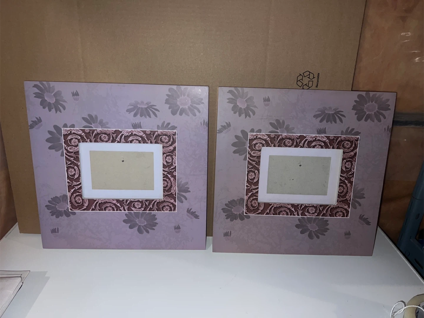 Selling a set of two wall picture frames. They feature a lovely floral design in shades of purple and brown. Perfect for adding a touch of elegance to any room!