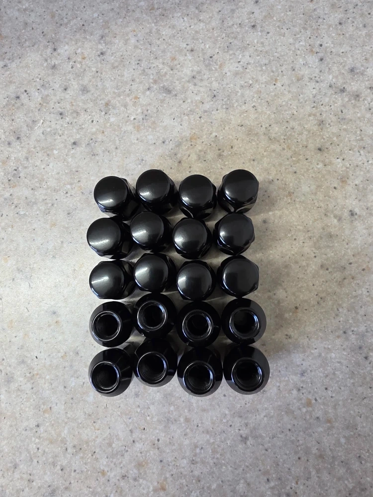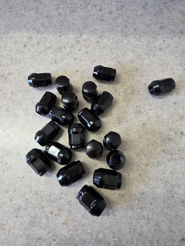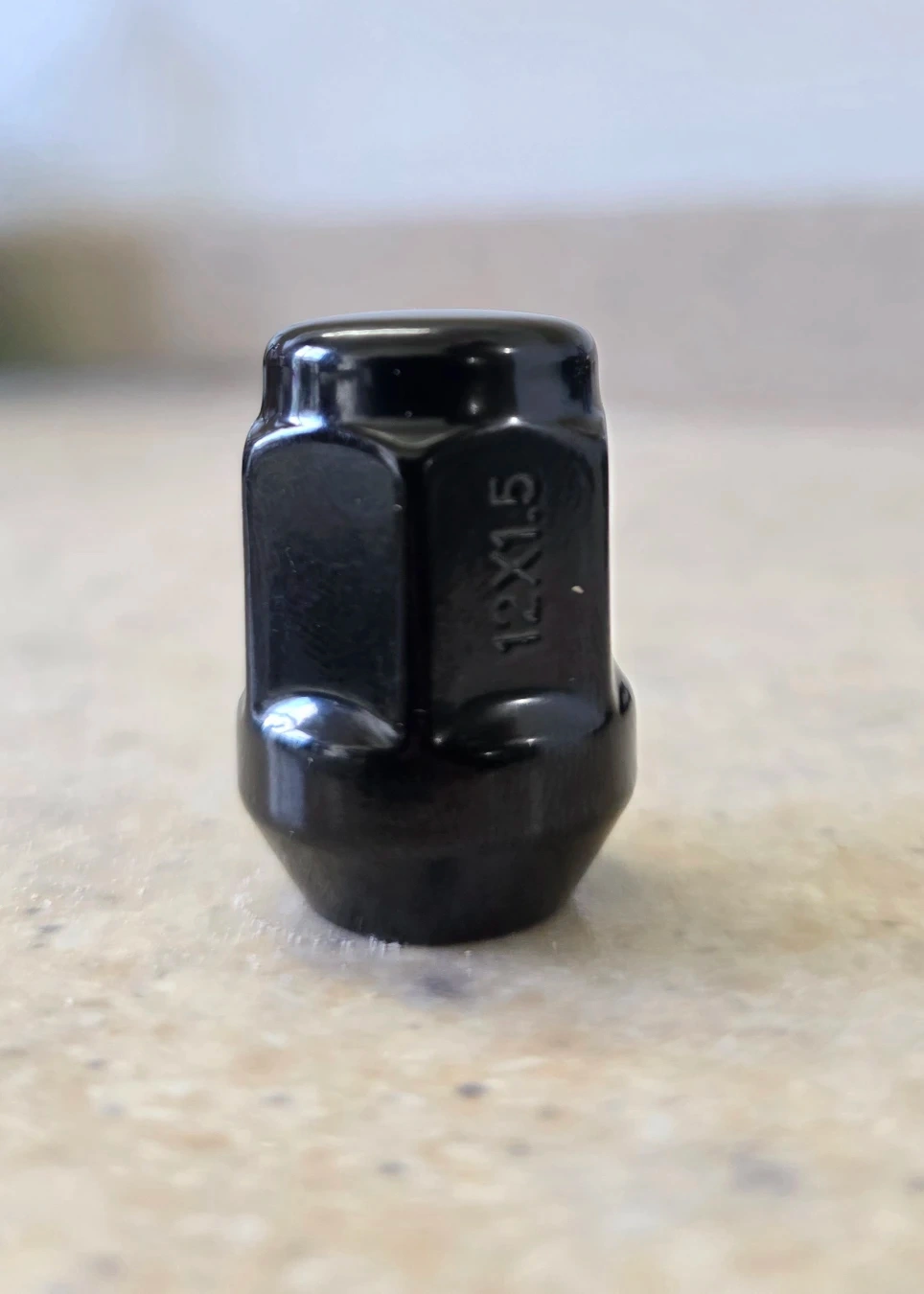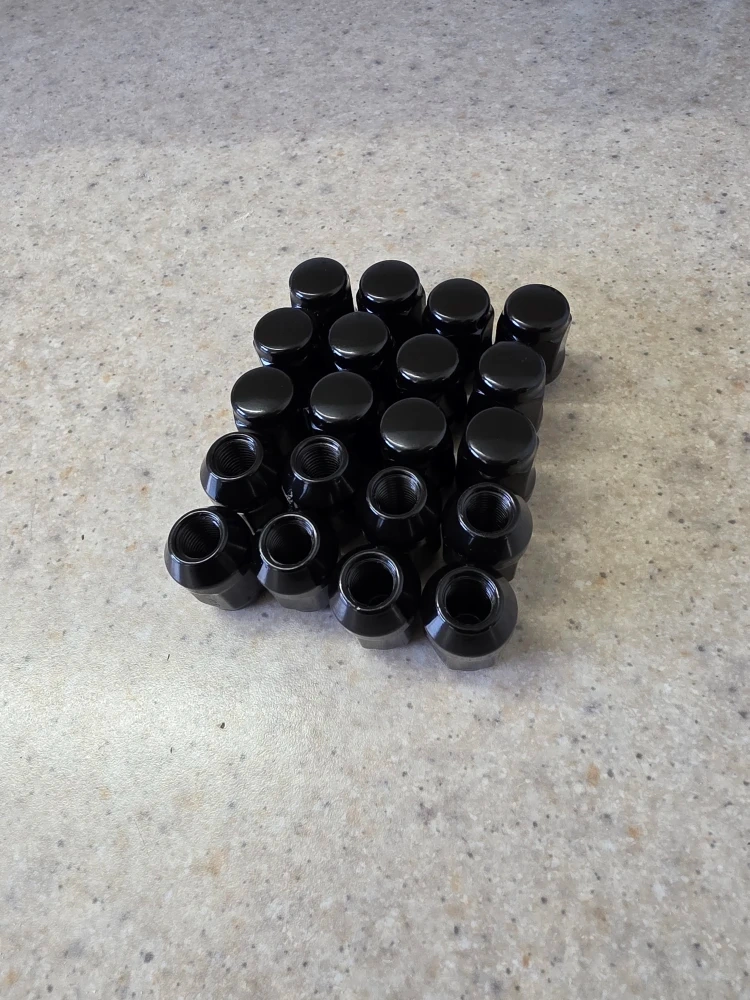 10Selling a set of 20 black lug nuts. They are size 12x1.5. Perfect for replacing your old or damaged lug nuts! Brand new Good for toyota corolla, camry ,Honda,Hyundai most of the vehicle