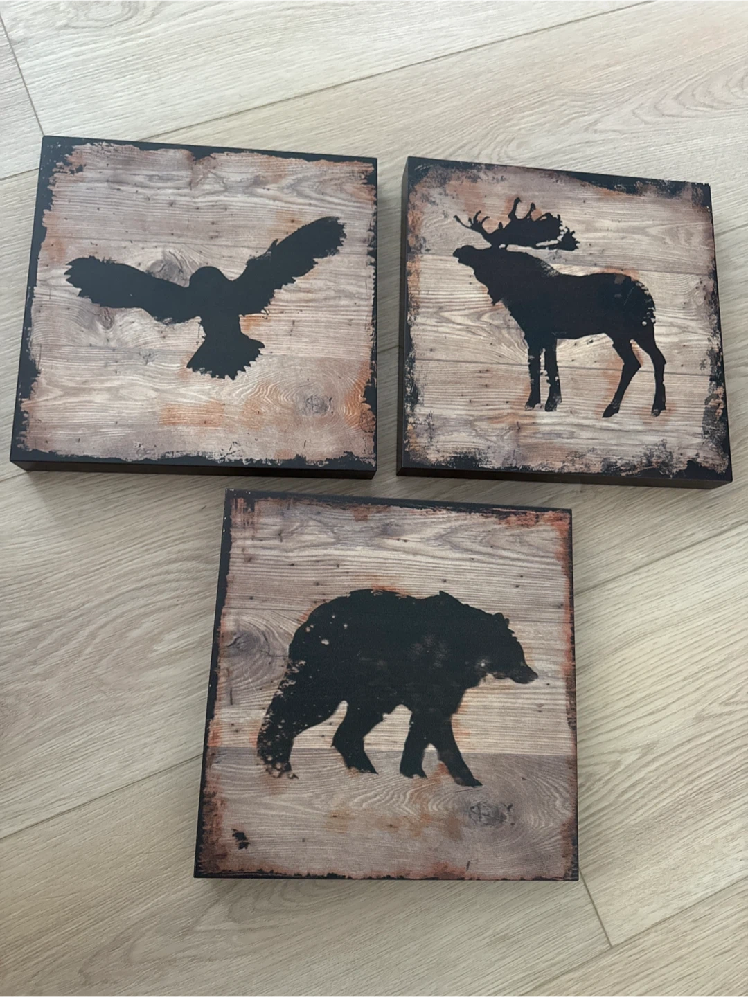 15Selling a set of three wall art pieces featuring animal silhouettes: an owl, a moose, and a bear. They're perfect for adding a rustic touch to any room in your home!