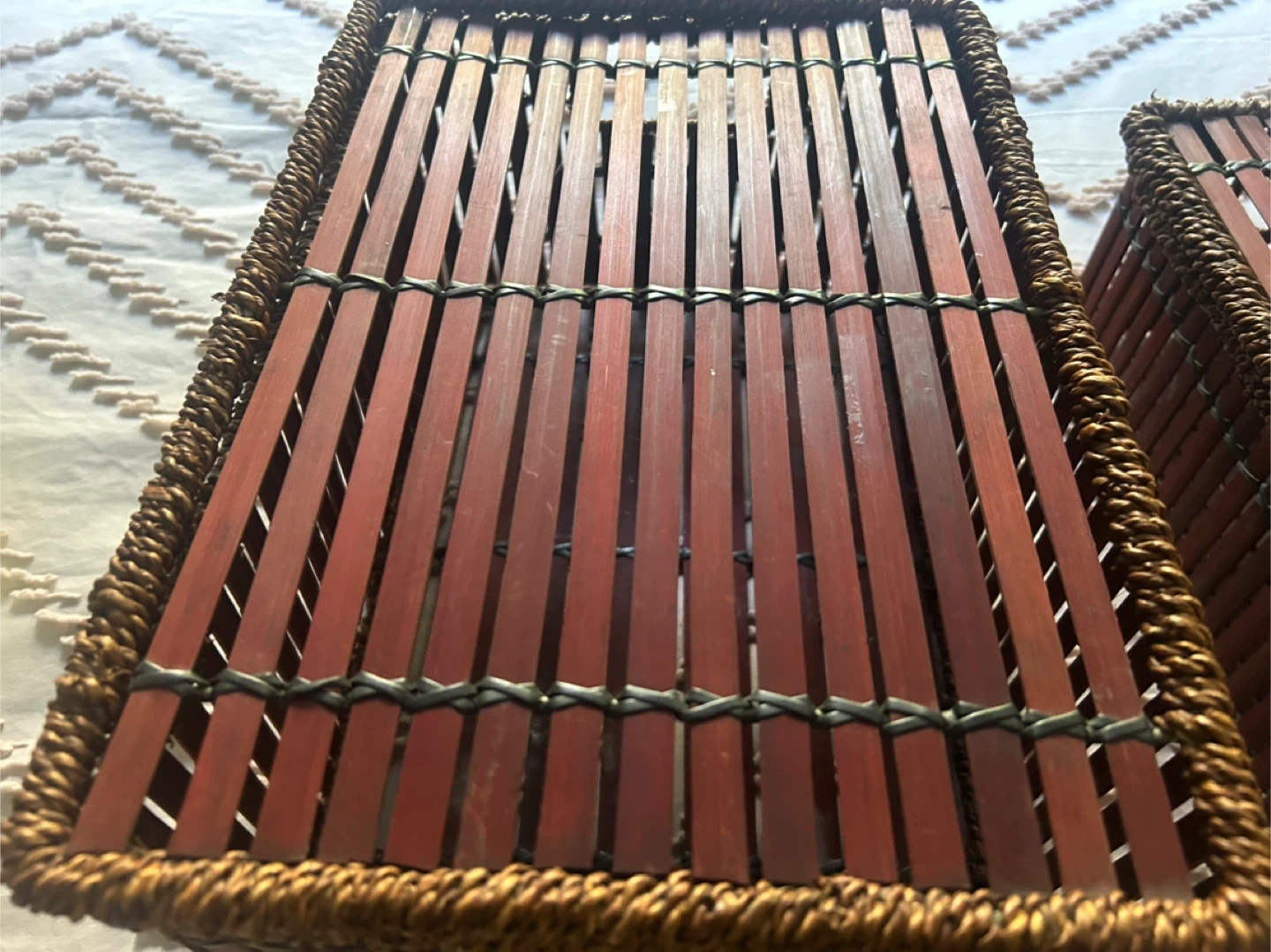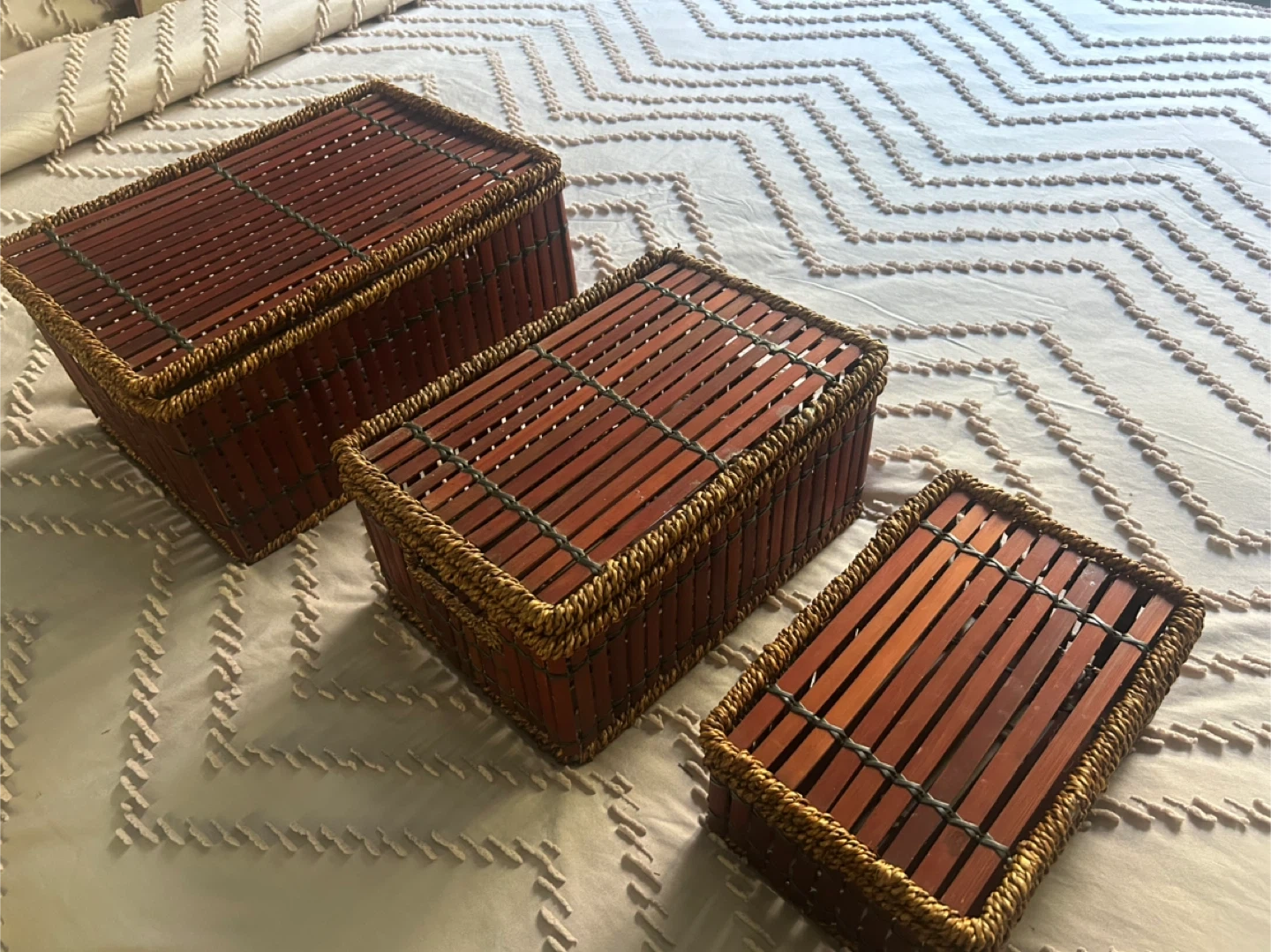 69Here's a set of three bamboo storage baskets! They're in excellent condition! Also “stackable”.