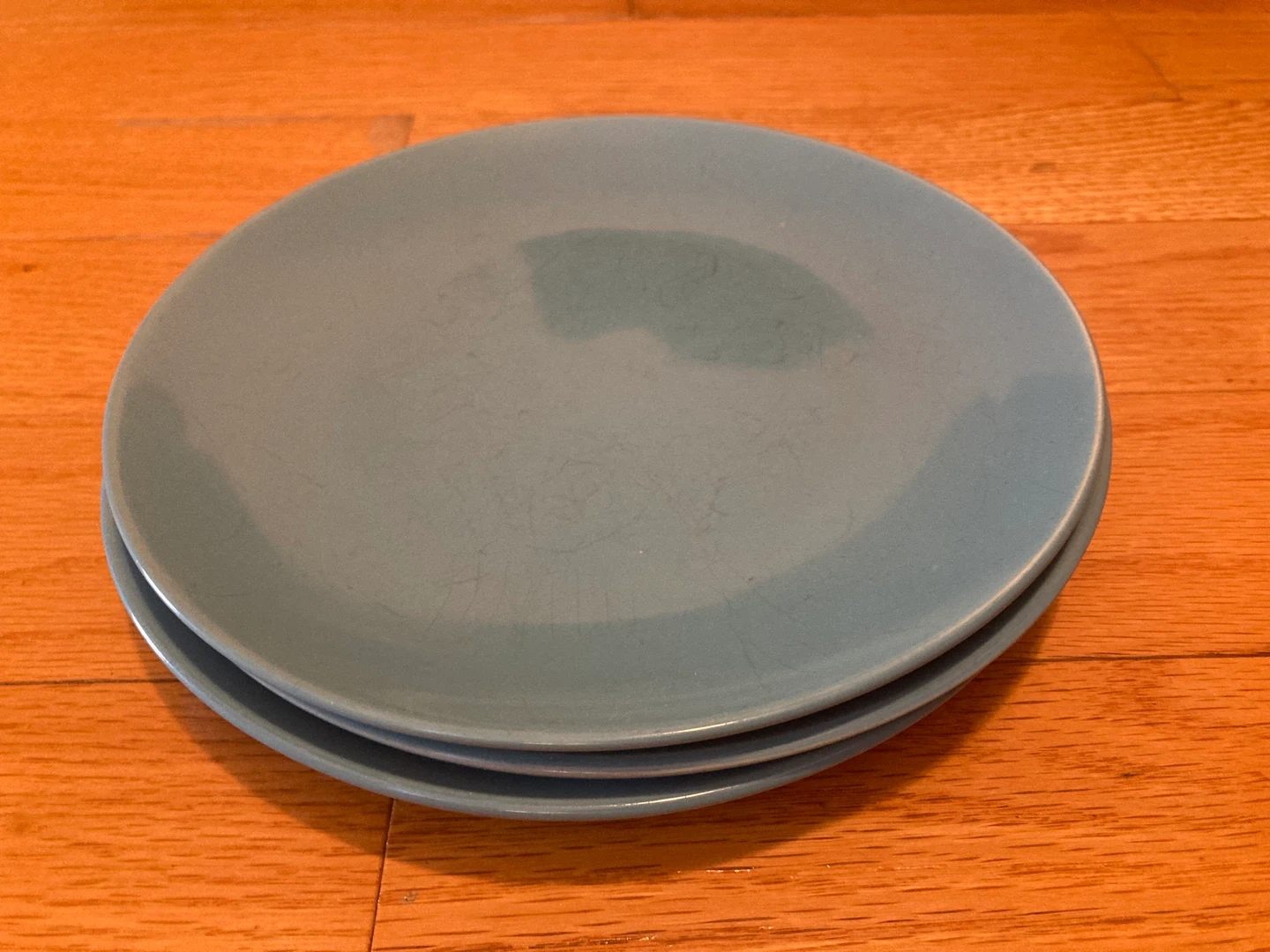 Selling a set of three plates in a lovely blue colour. They're perfect for everyday use or for adding a touch of colour to your table setting. They are in used condition (scratches) with some signs of wear. Diameter: 21cm