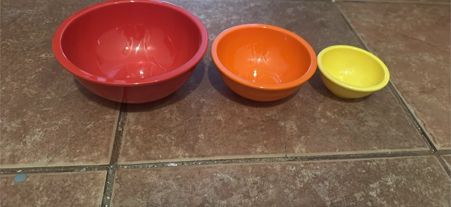 94Selling a set of three bowls in red, orange, and yellow. They're in good condition and ready for a new kitchen!