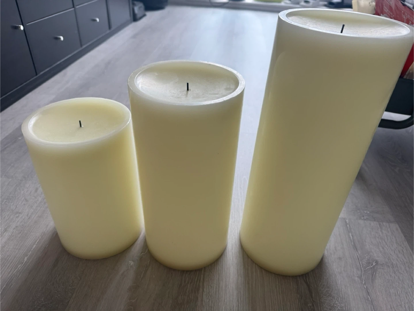 Selling a set of three cream-coloured pillar candles. They're in great shape and would look lovely in any room. Perfect for creating a cozy atmosphere!