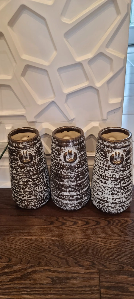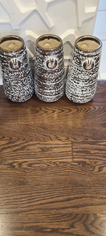10Selling a set of three decorative vases. They feature a unique brown and white textured design, perfect for adding a touch of rustic charm to your home. They are in great condition!