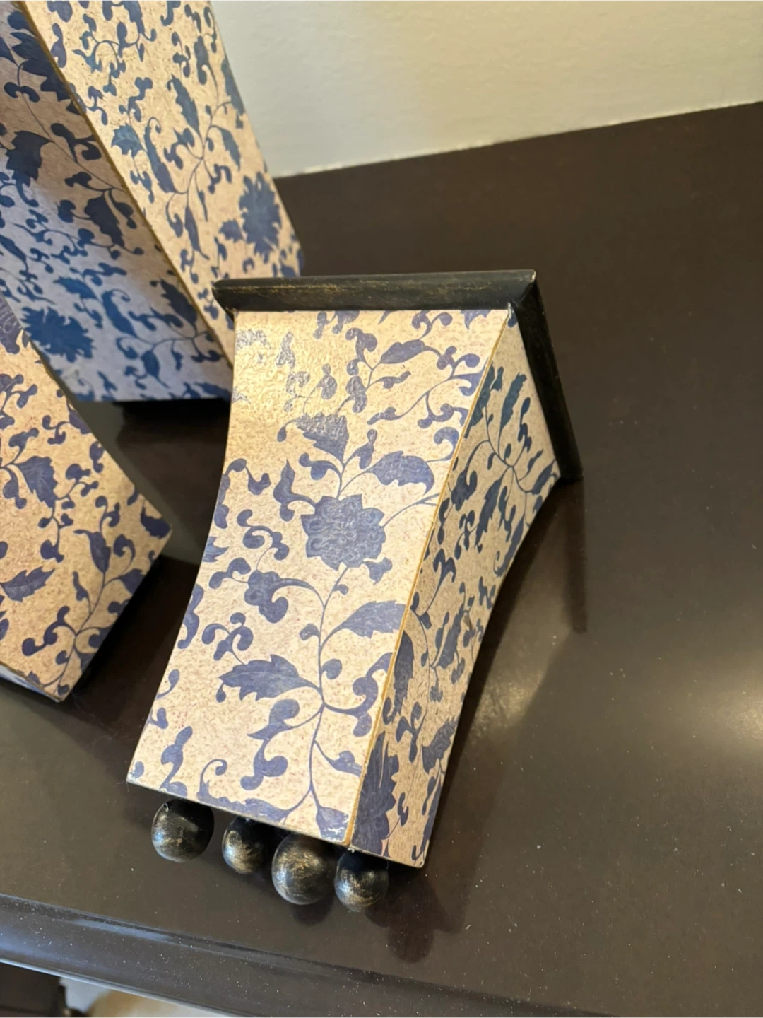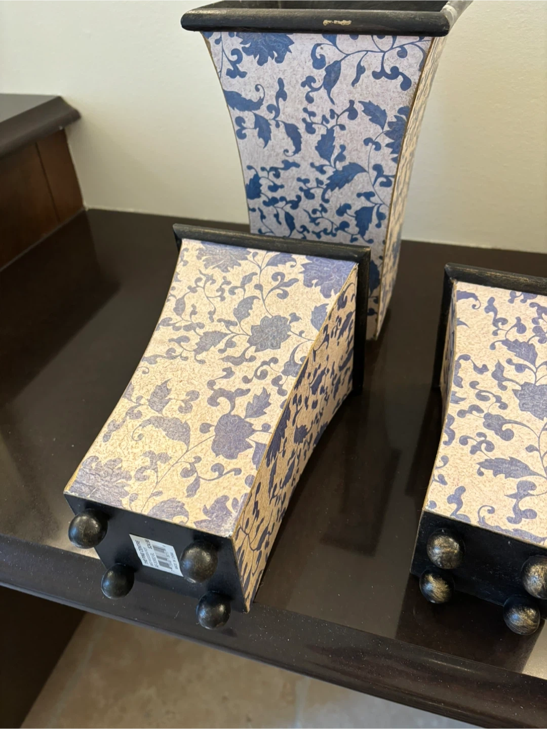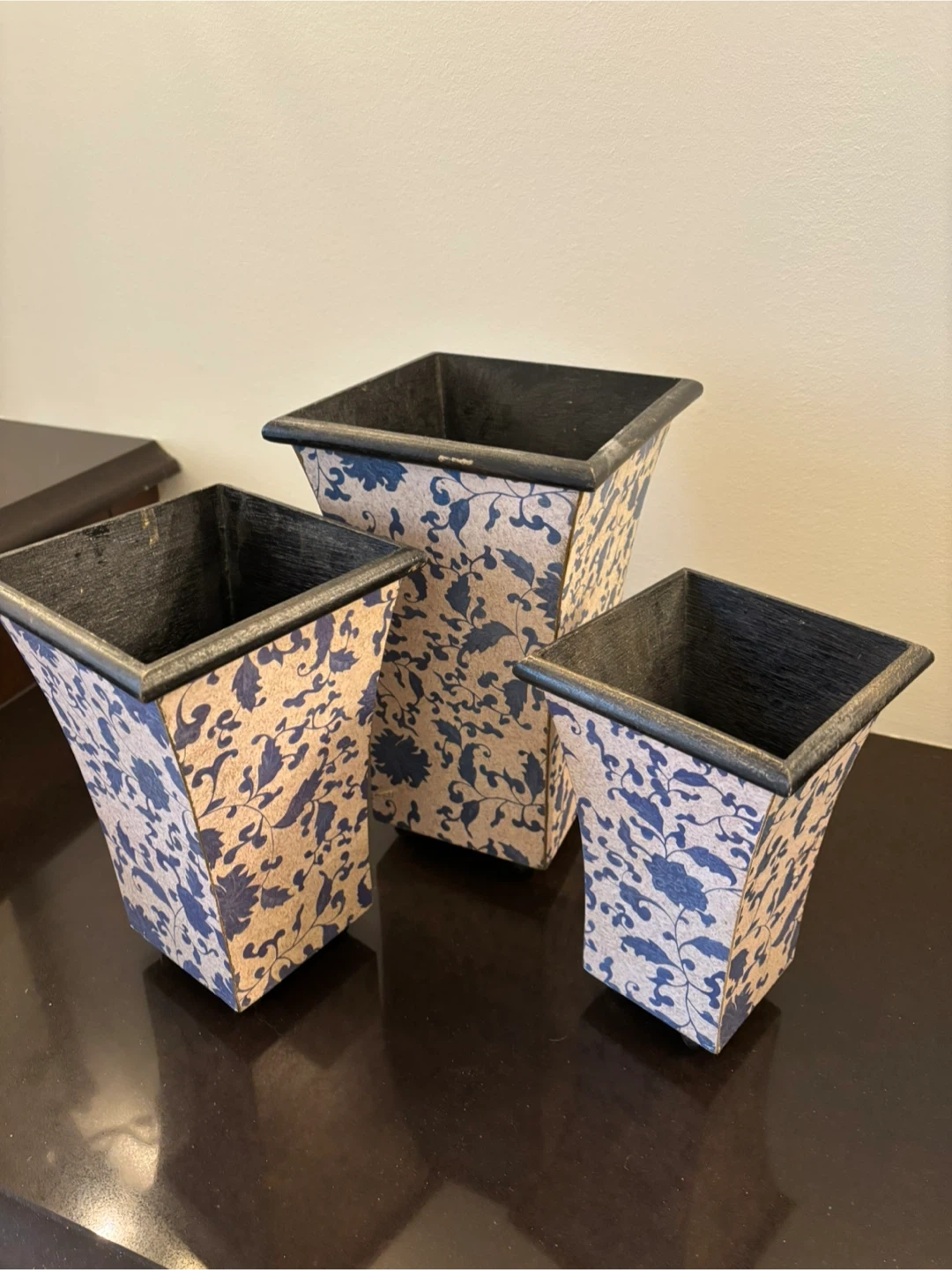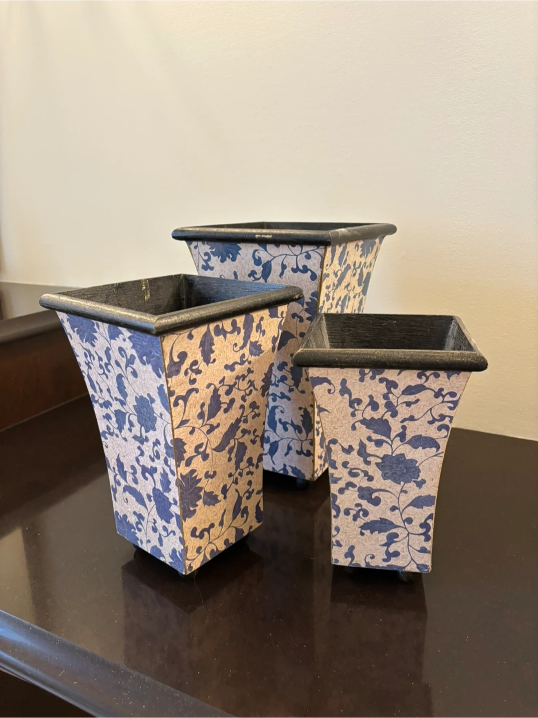 Selling a set of three decorative planters with a lovely floral pattern. They would look great in any room!