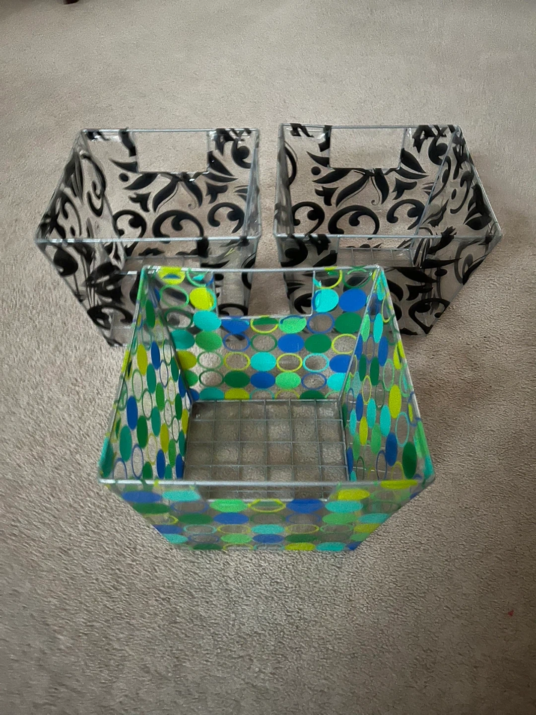 10Selling a set of three decorative storage bins! Two are black and white patterned, and one is a colourful polka dot design. Perfect for organizing your space with a touch of style