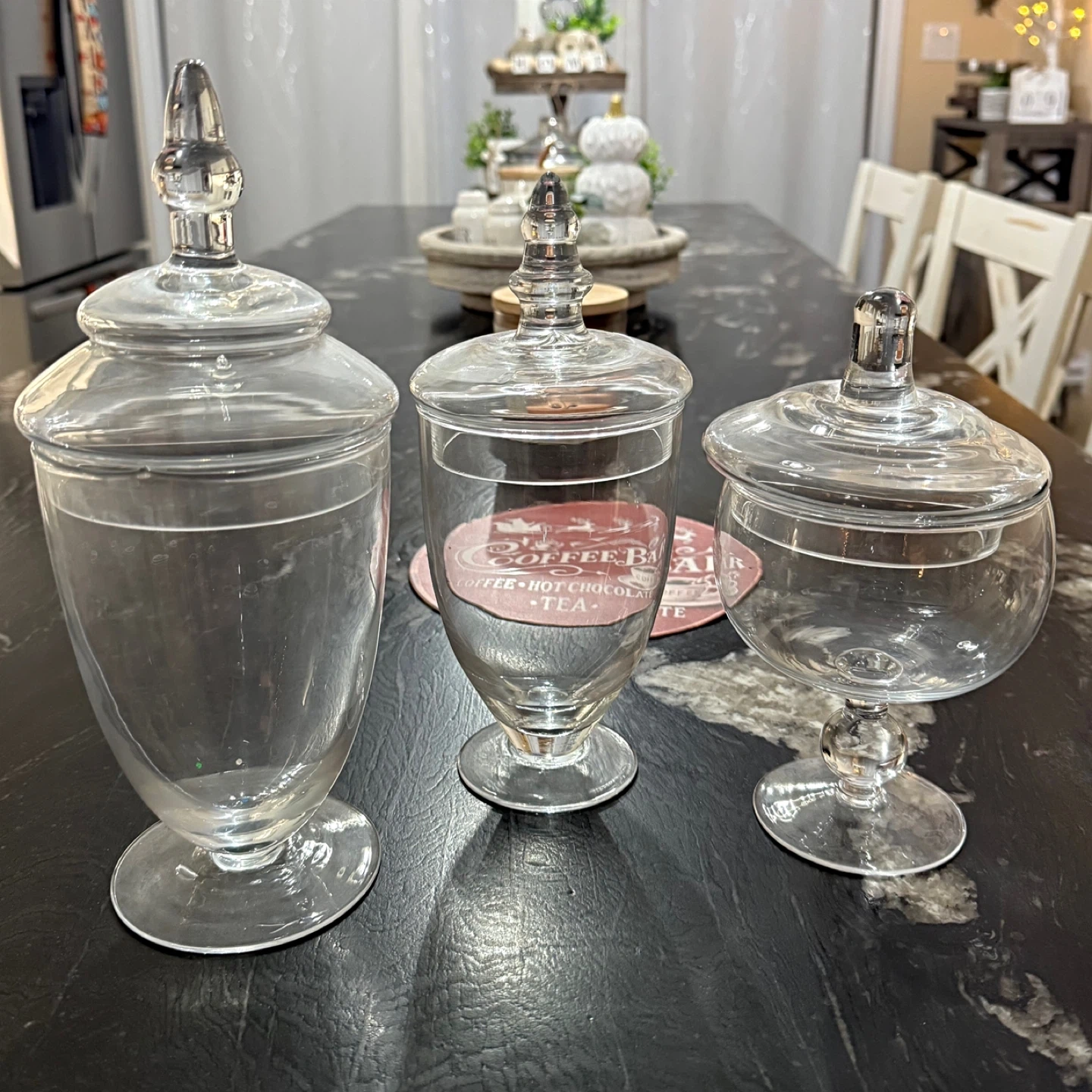 61Selling a set of 3 glass candy jars. They're in great shape and would look lovely in any kitchen or dining room. Perfect for storing candy, spices, or small trinkets. CASH ONLY PICK UP ONLY