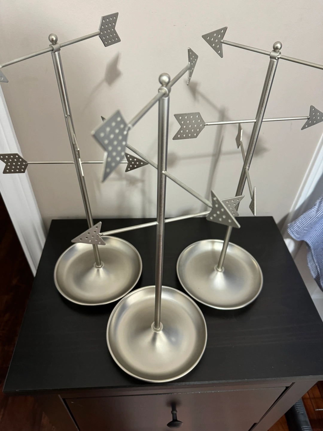Set of 3 silver arrow jewelry stands. Gently used, nothing wrong with them just don’t need them anymore!