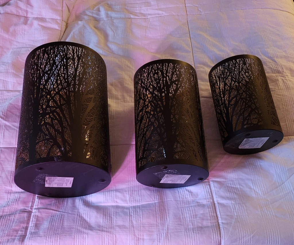 Selling a set of three metal candle/Pot holders (plastic insert) holders with a tree design. They come in graduated sizes and are in great condition. Perfect for adding a touch of nature to your home decor!