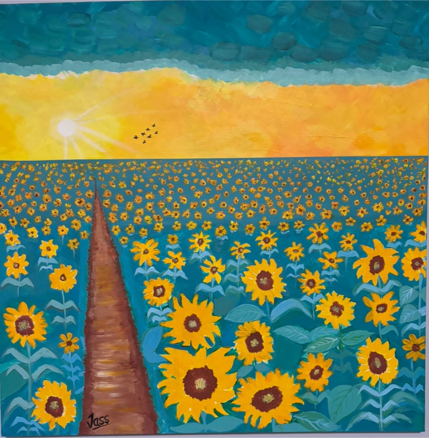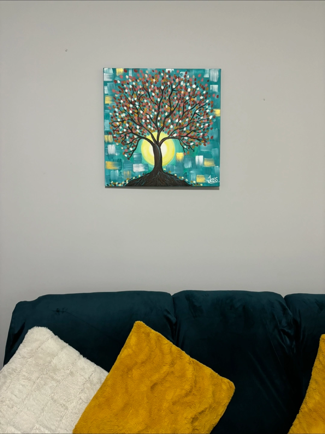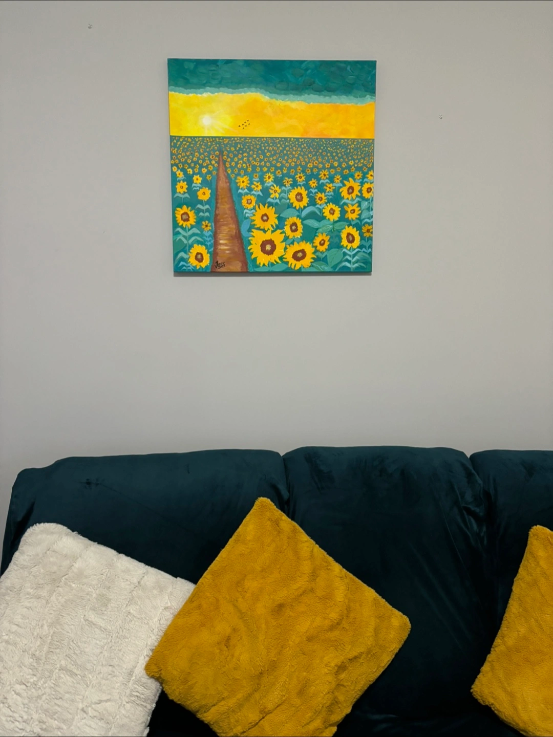 Three unique acrylic paintings. Sunflowers, tree, and ocean scenes. Vibrant colours. Canvas size 24 by 24 inches Signed by artist. $75 each canvas artwork or $200 for all 3