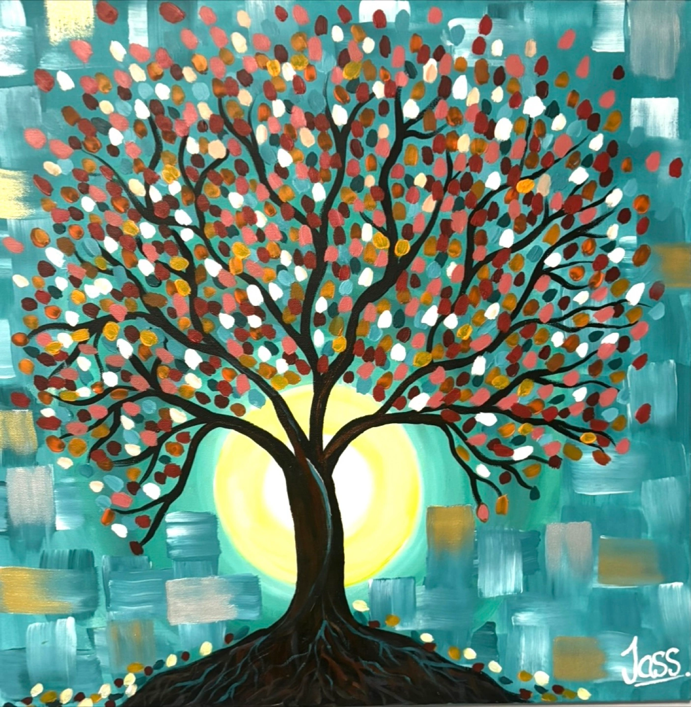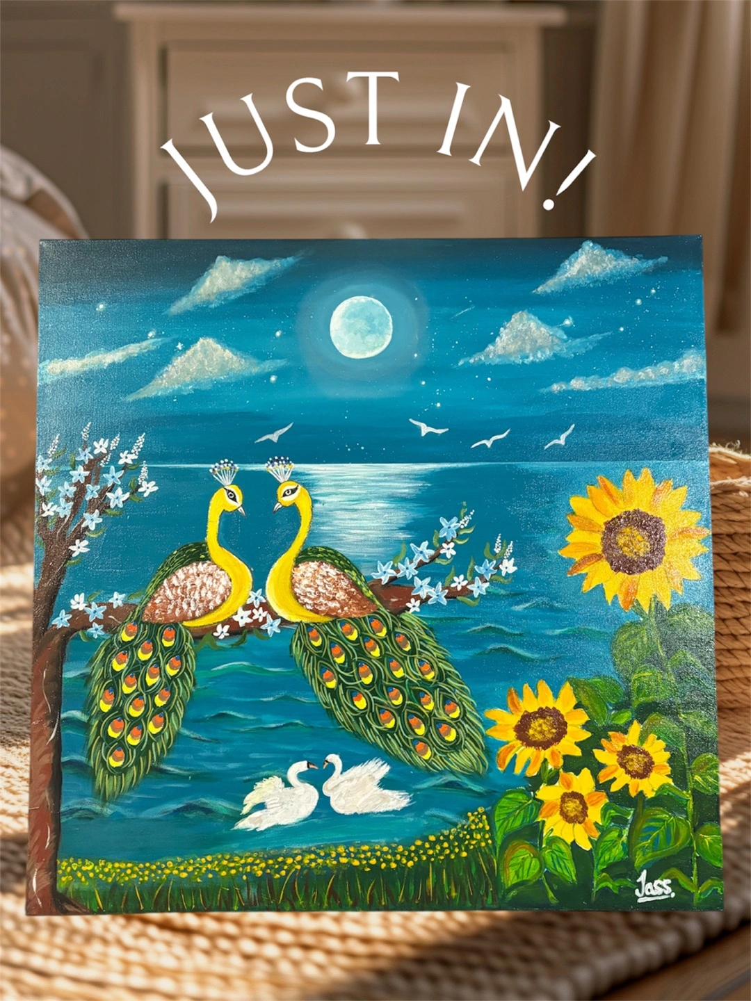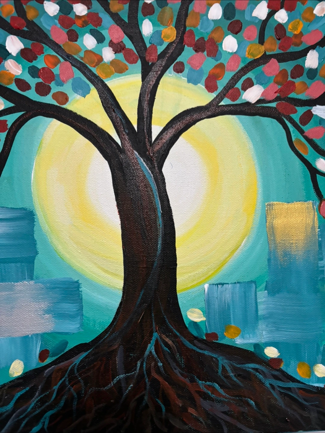 Three unique acrylic paintings. Sunflowers, tree, and ocean scenes. Vibrant colours. Canvas size 24 by 24 inches Signed by artist. $75 each canvas artwork or $200 for all 3
