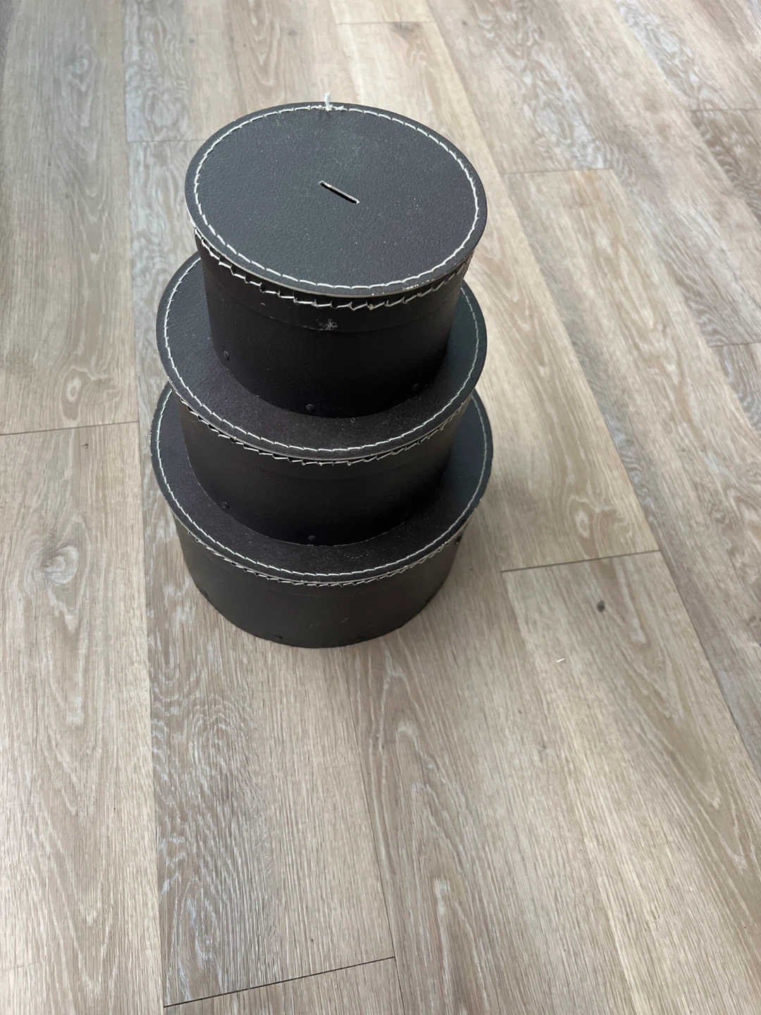 15I'm selling a set of three round nesting boxes. They're black with white stitching around the edges. Great for storage or decoration!