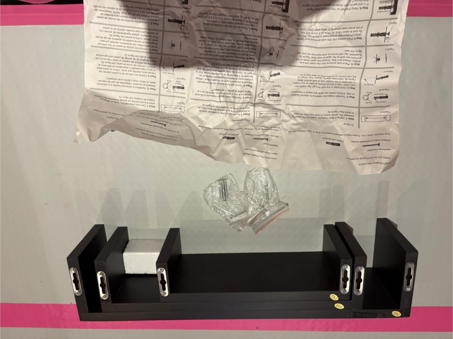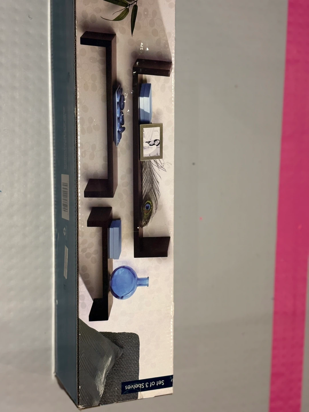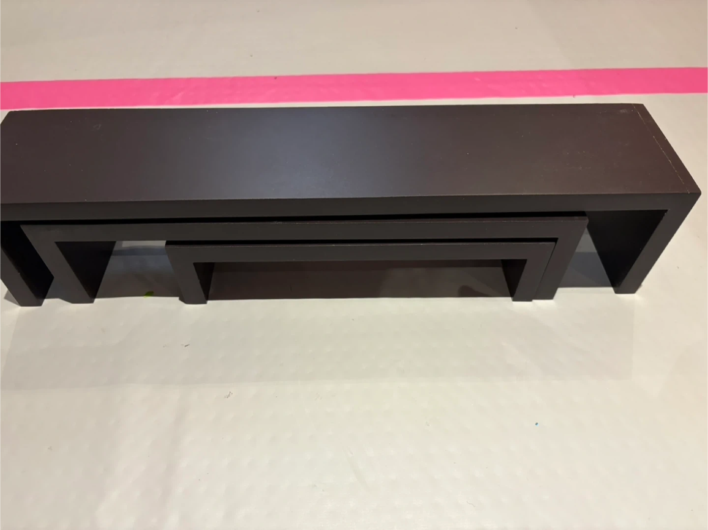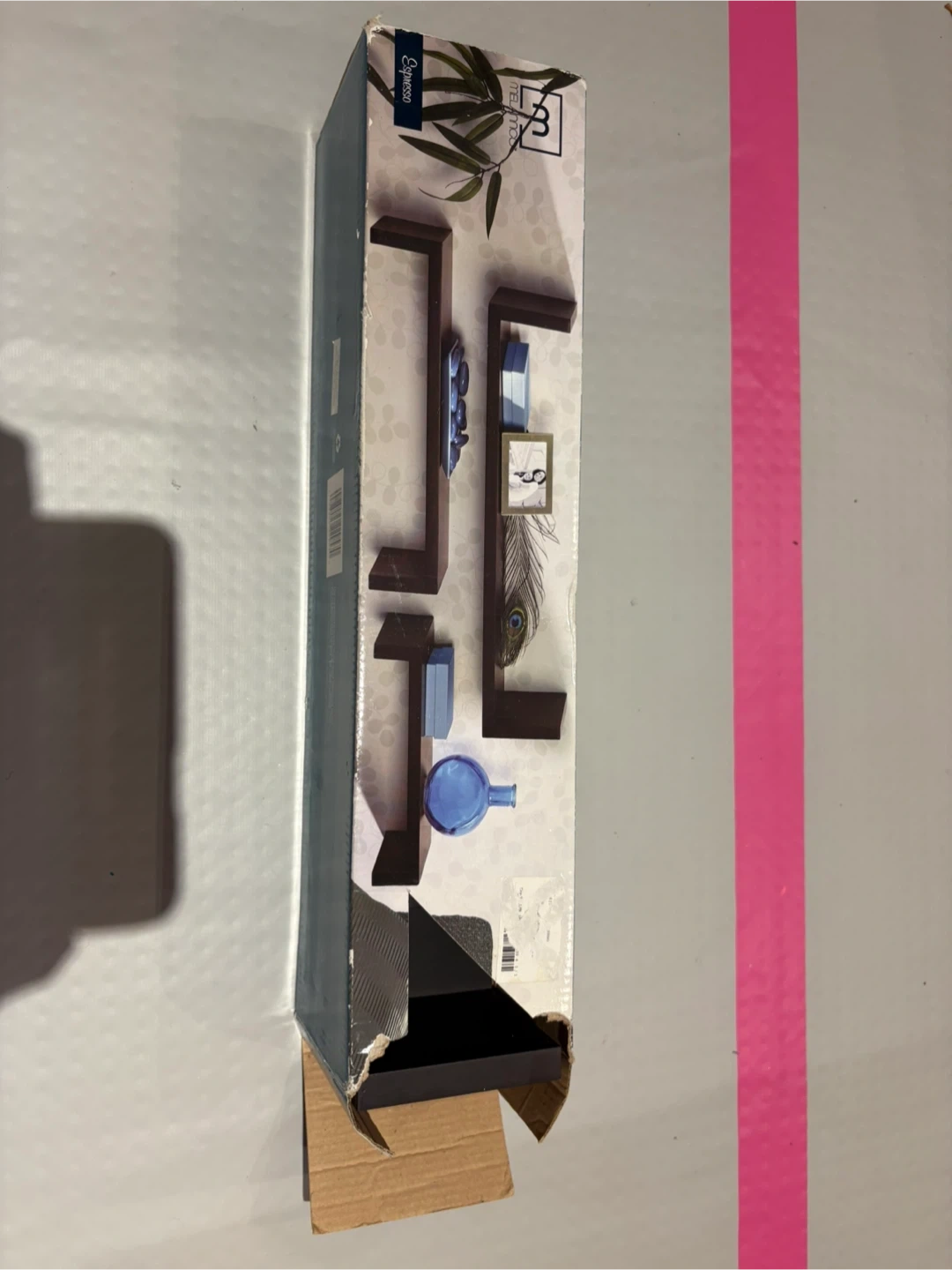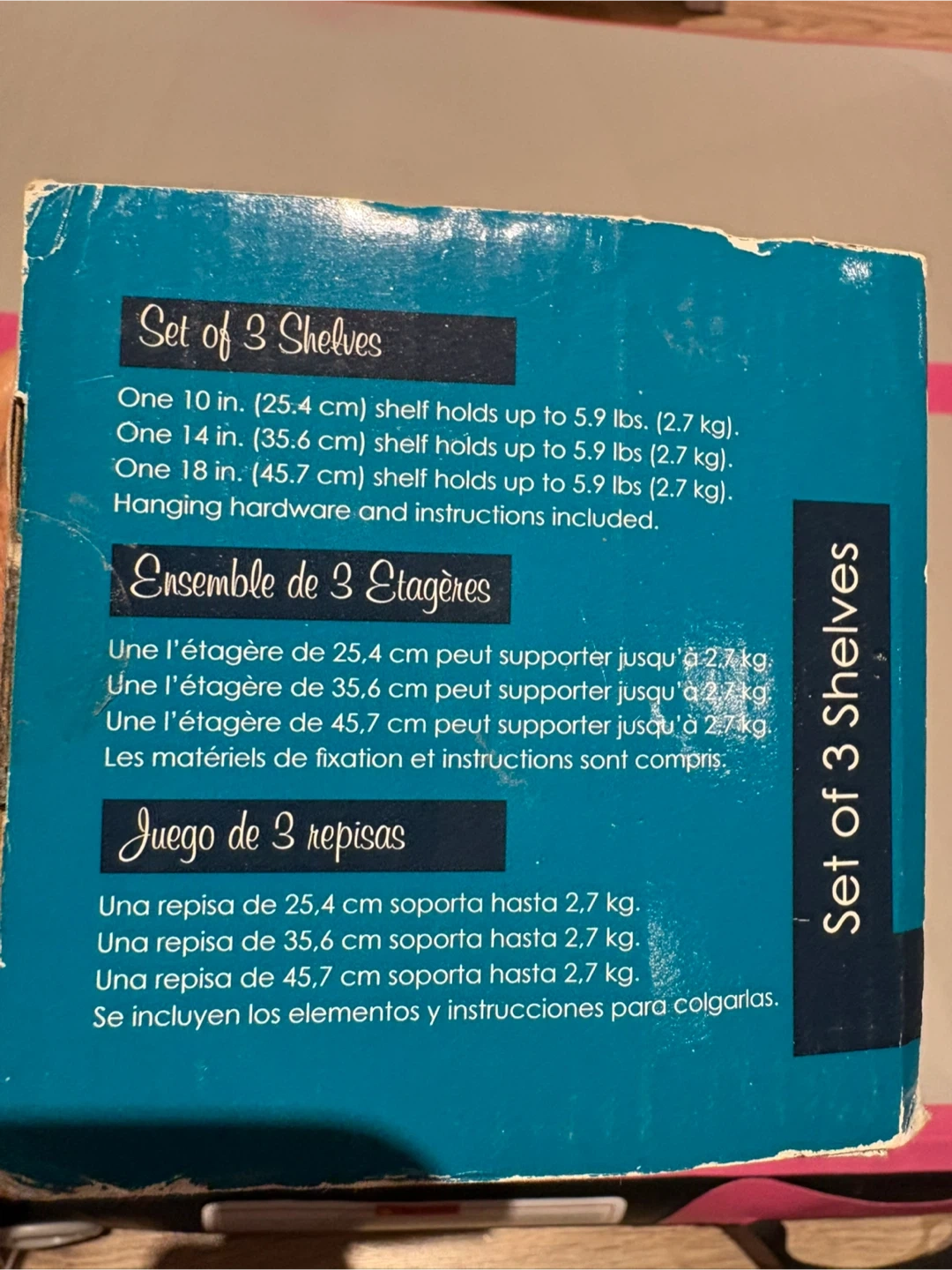 New. Selling a set of 3 shelves! The box says it includes hanging hardware and instructions. Color expreso. The shelves are different sizes: - One 10 in (25.4 cm) shelf holds up to 5.9 lbs (2.7 kg) - One 14 in (35.6 cm) shelf holds up to 5.9 lbs (2.7 kg) - One 18 in (45.7 cm) shelf holds up to 5.9 lbs (2.7 kg)