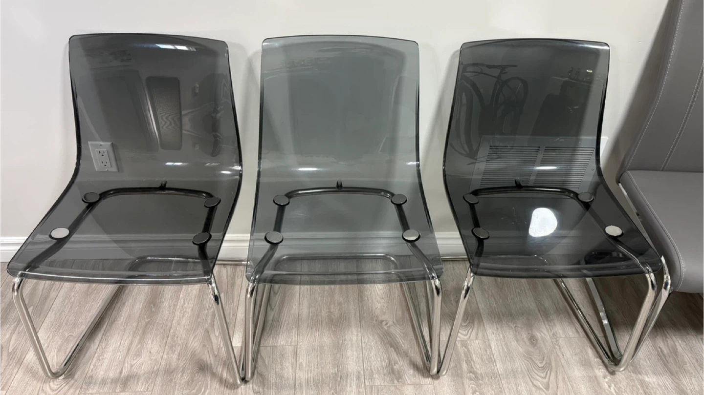 60Selling a set of three dining chairs. They feature a smoke-grey, transparent seat and back with a chrome-finished metal frame. Great for adding a modern touch to your dining space! We bought from IKEA ($100 each for brand new). We sell for each $25, $60 for all 3 chairs!