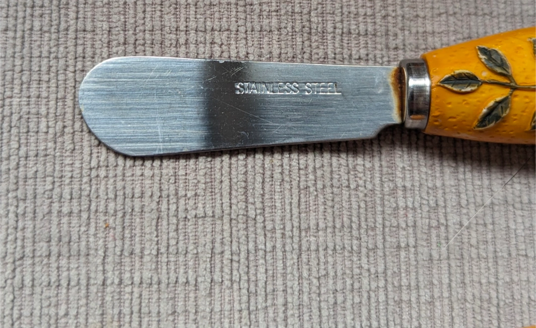 Selling a set of three butter spreaders. They are made of stainless steel and have a unique yellow handle design with leaf accents. These are perfect for adding a touch of elegance to your table setting!