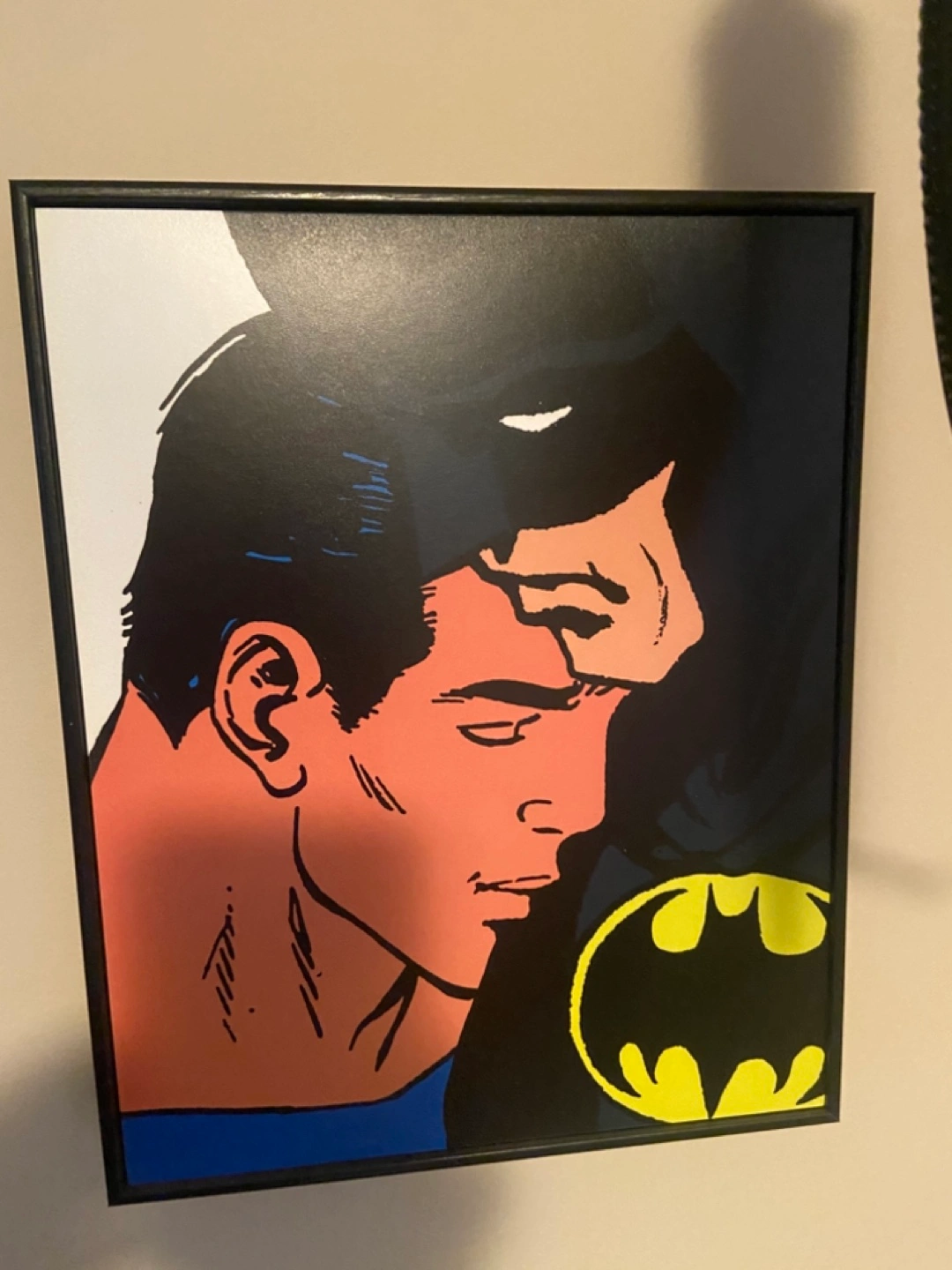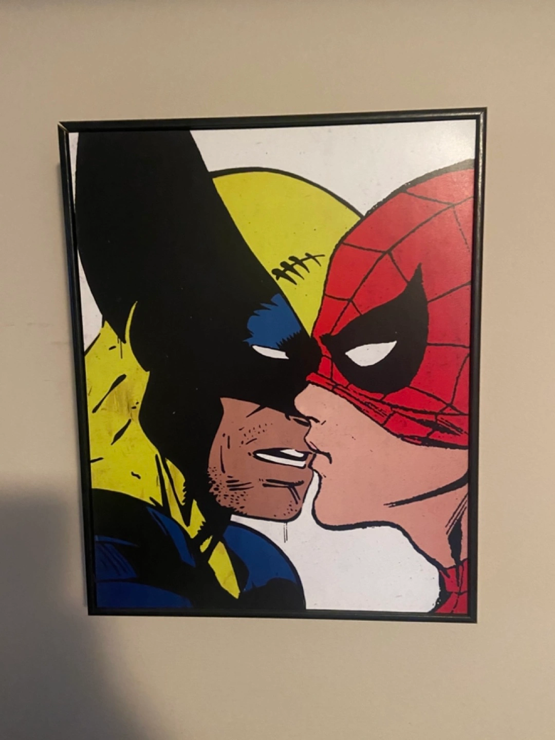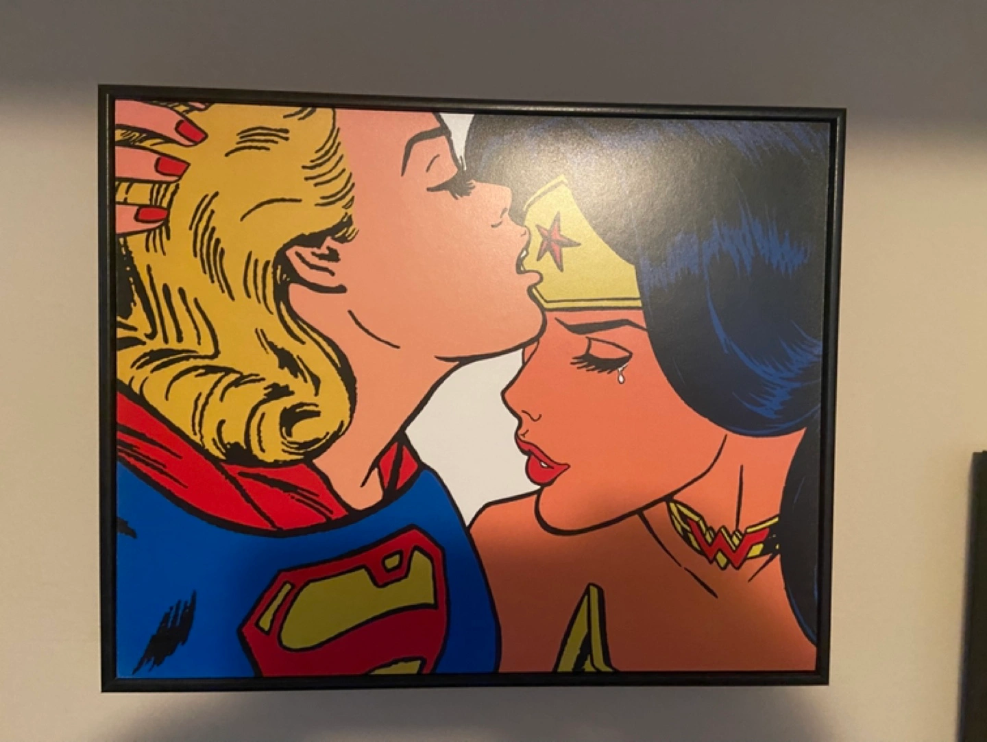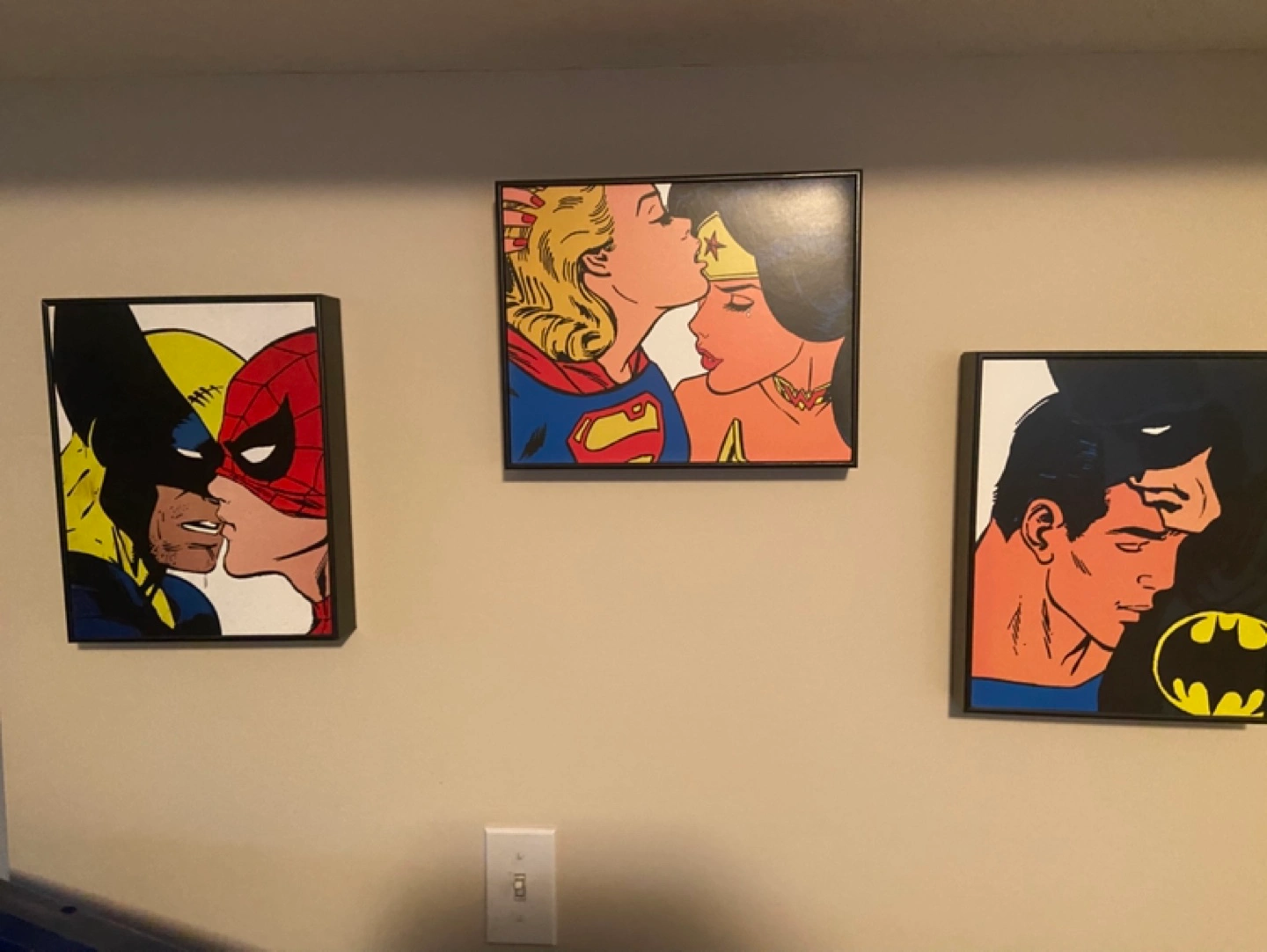 Set of 3 framed art prints. Each print features a different pairing of superheroes in a romantic pose. Alex cherry. 40$ each.
