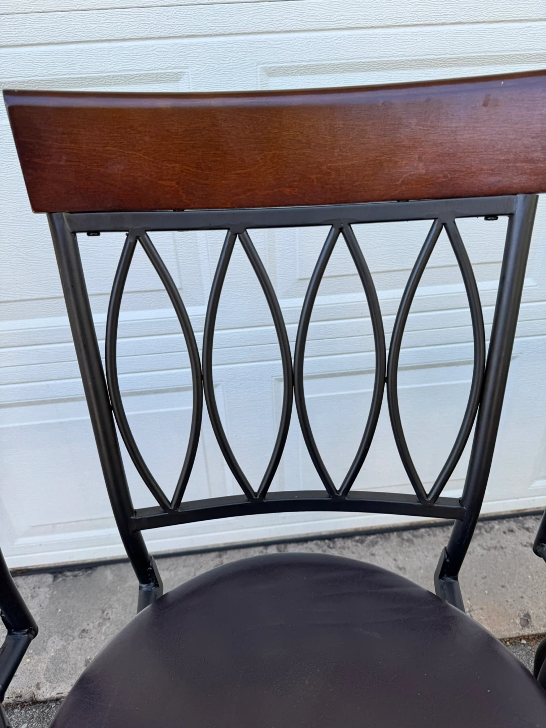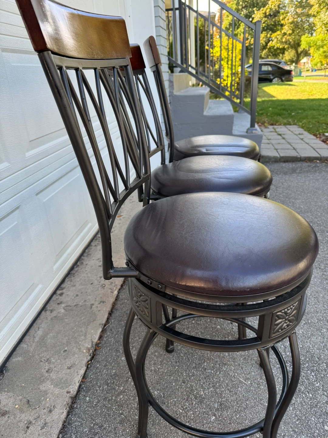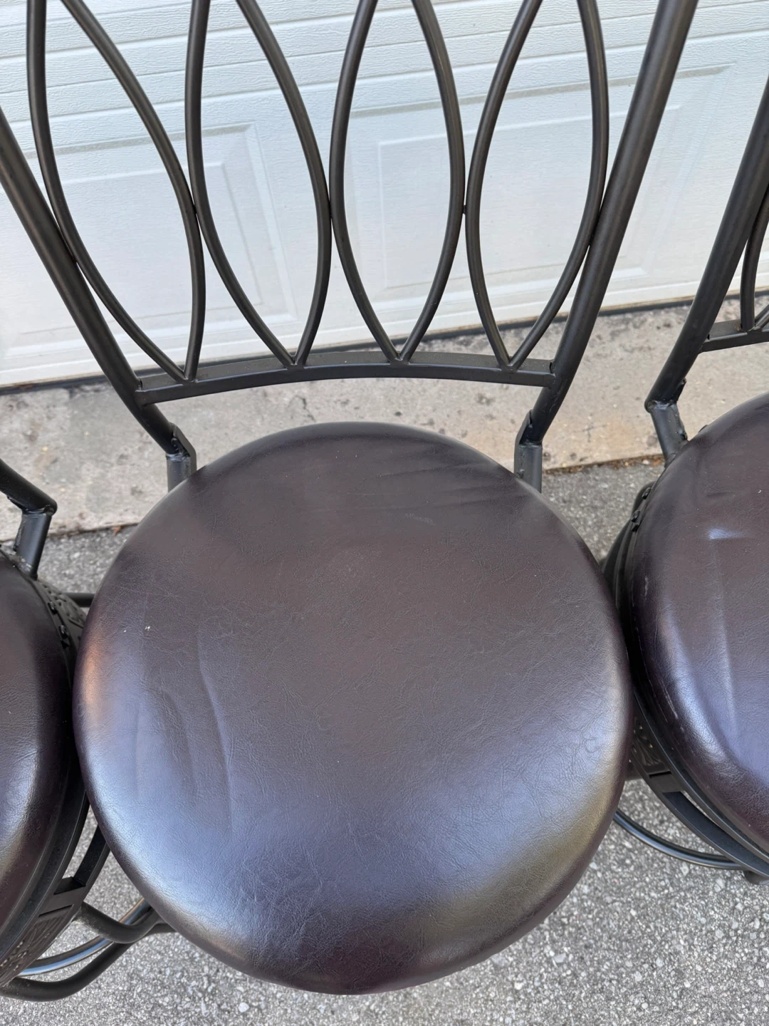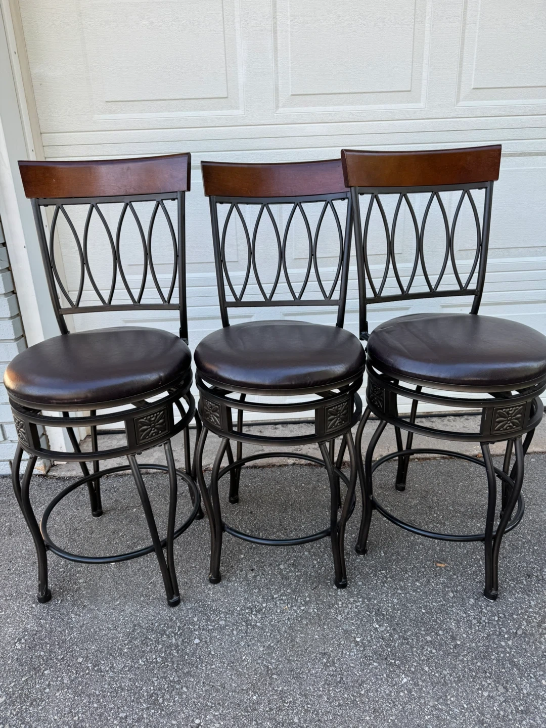 Selling a set of three swivel bar stools. They have a dark brown faux leather seat and a metal frame with a decorative back. They're in good condition and would look great in any kitchen or bar area!