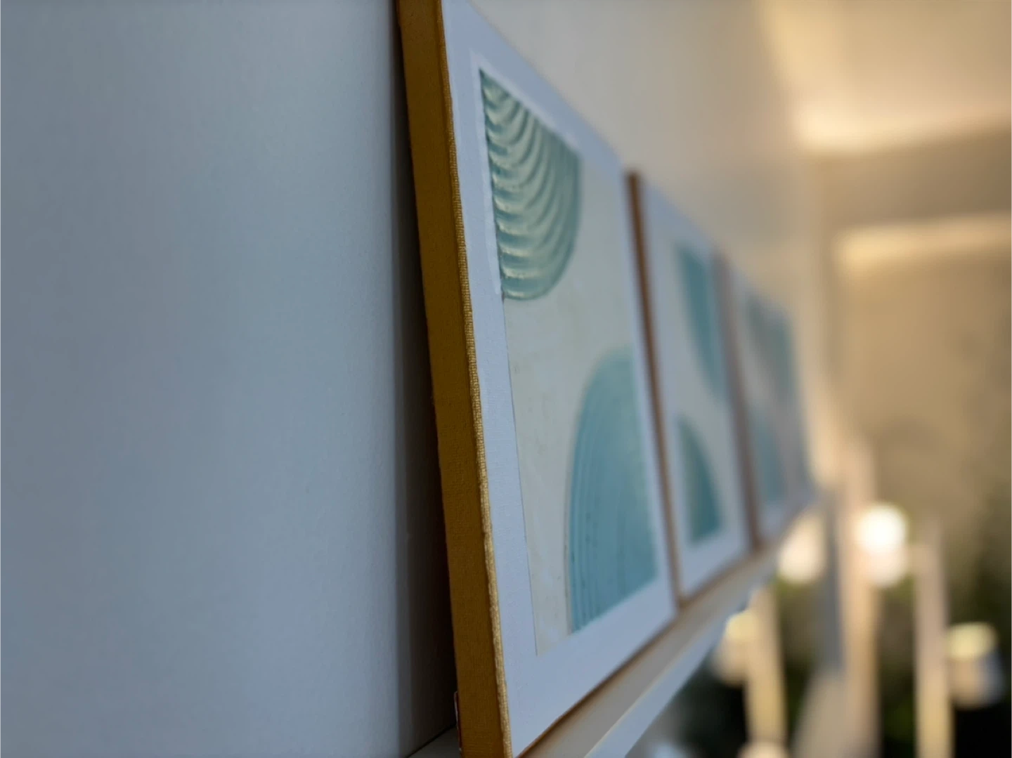 10Spruce up your space with this set of three unique textured wall art pieces! They feature a modern design with raised, curved patterns in a calming teal and neutral palette. Perfect for adding a touch of sophistication to any room Smoke free and pet free home MEASUREMENTS: 10 inches by 8 inches