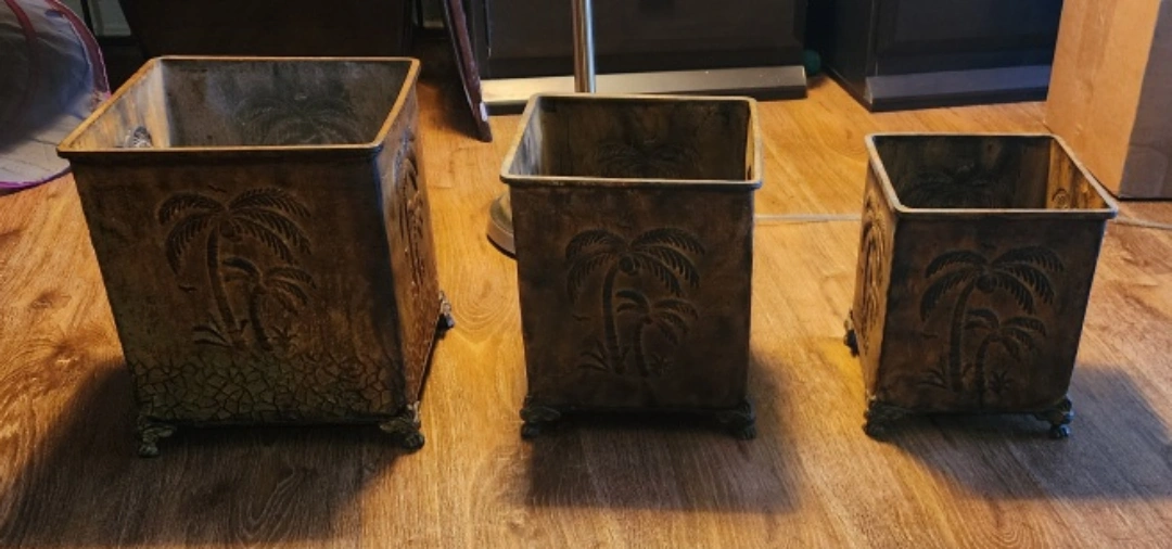 Selling a set of three tin square planters, perfect for adding a tropical touch to your home or garden! They feature a raised palm tree design and have small feet. Sizes vary slightly as shown in the picture.