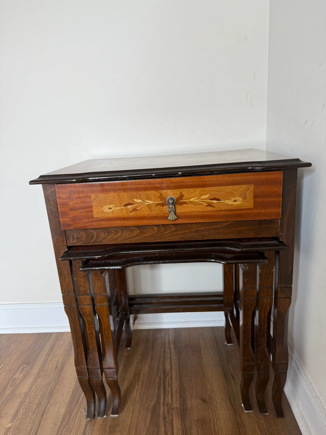 18Elegant set of 3 vintage nesting tables featuring intricate inlaid wood floral designs and classic marquetry detail. The largest table includes a pull-out drawer with a decorative keyhole accent (no key). ✨ Features: • Set of 3 nesting tables (stackable design) • Decorative floral inlay / marquetry pattern • One table includes a storage drawer • Solid wood with rich tones and carved edges • Perfect as accent tables, side tables, or nightstands 🪵 Condition: Vintage/pre-owned. Overall sturdy with gorgeous detailing. Please note: the smallest table shows some surface marks and discoloration (see photos). The wear is consistent with age and adds to its vintage character. This unique set is both functional and decorative — perfect for adding a touch of timeless charm to any room