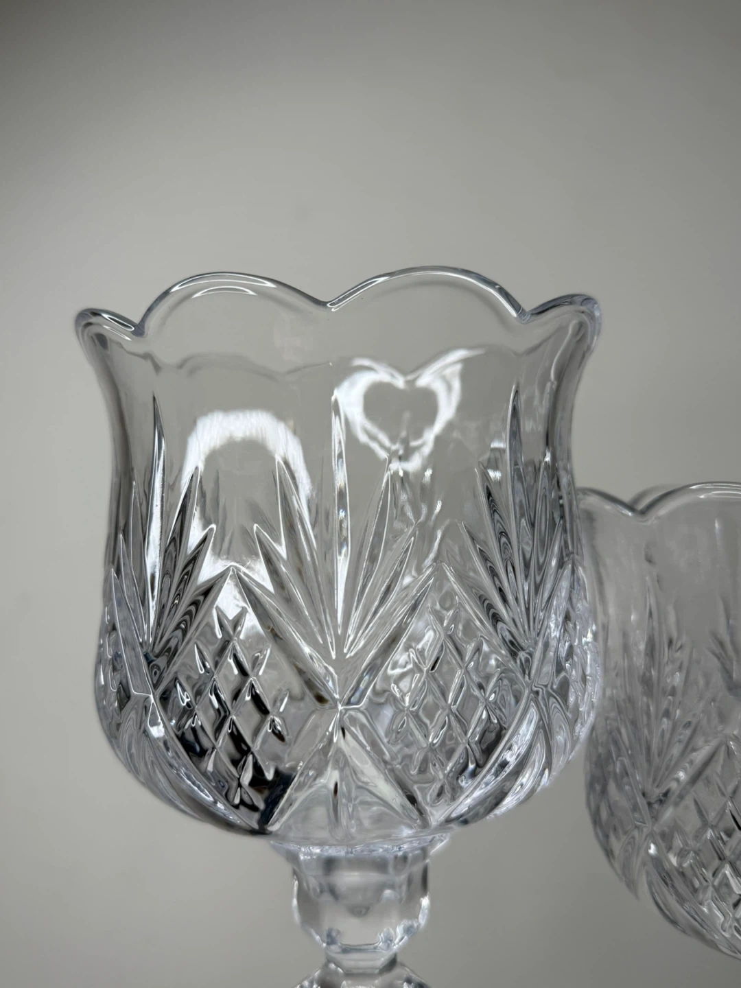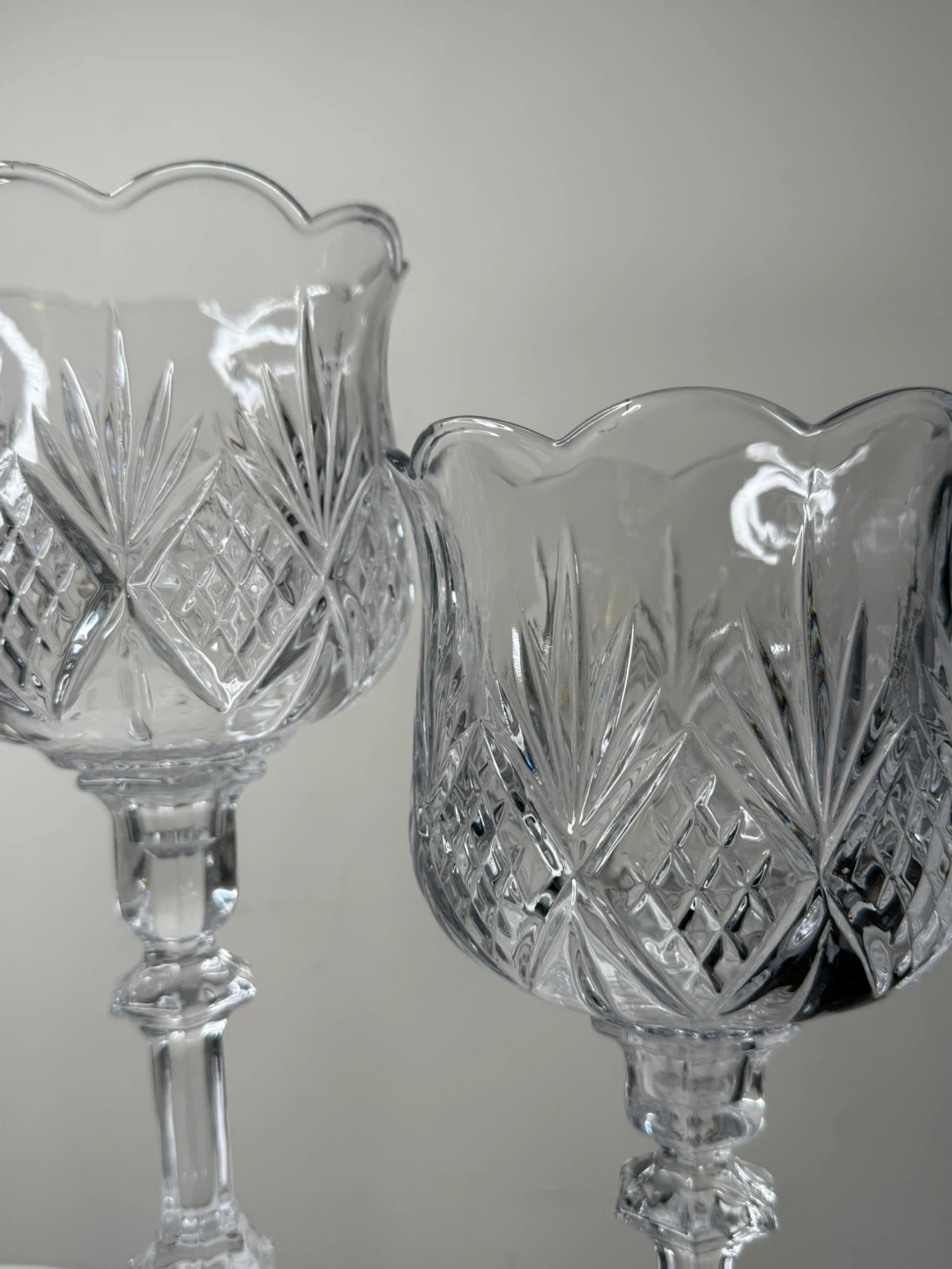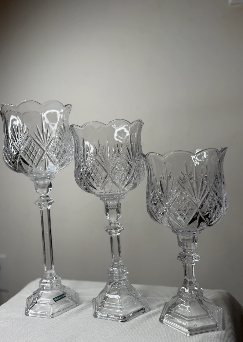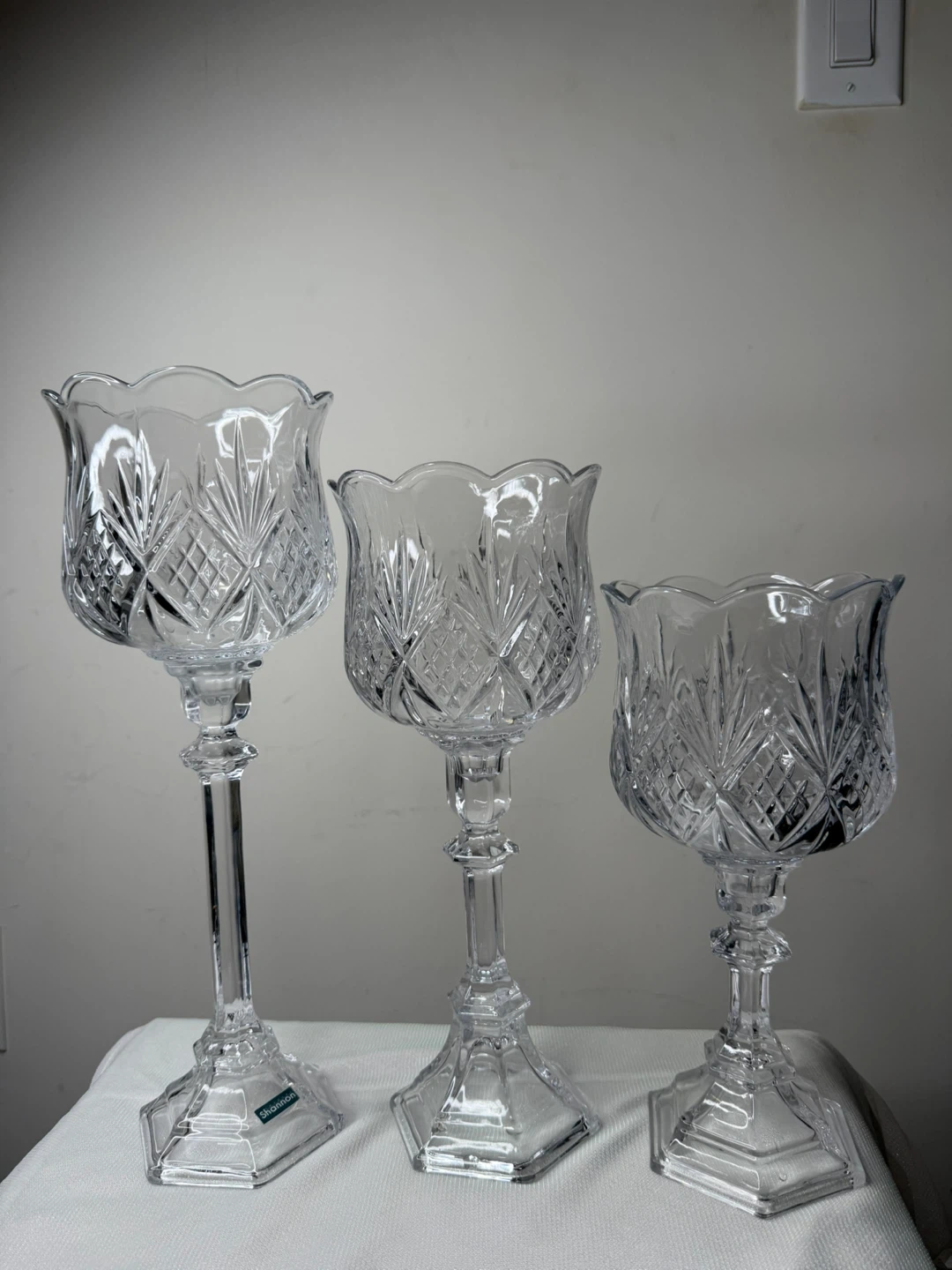 12Elegant set of 3 pedestal crystal bowls with intricate cut-glass detailing and scalloped edges. These pieces feature a classic diamond and leaf pattern and come in 3 different heights, making them perfect for creating a stunning display. ✨ Uses: • Candy dishes • Decorative centerpieces • Fruit bowls • Wedding / party table décor Each bowl has a sturdy pedestal base with a hexagon shape for extra stability. Condition: Excellent, no chips or cracks.
