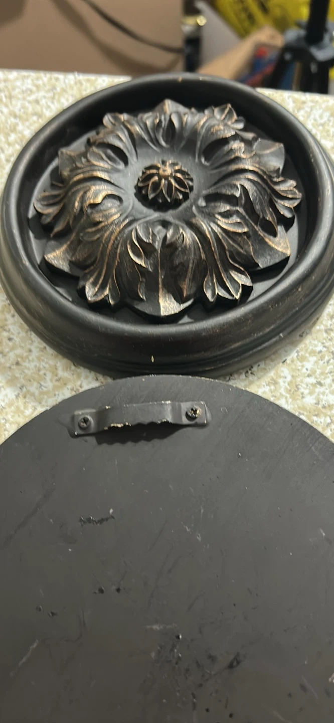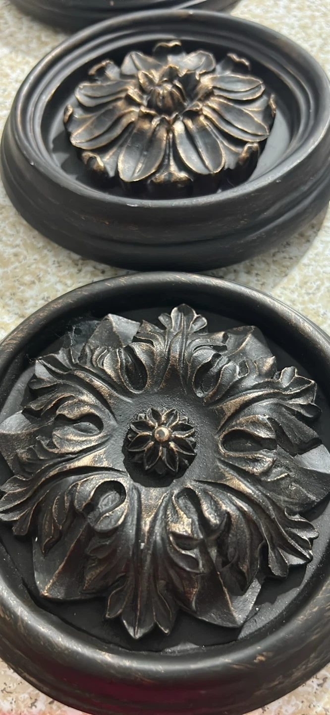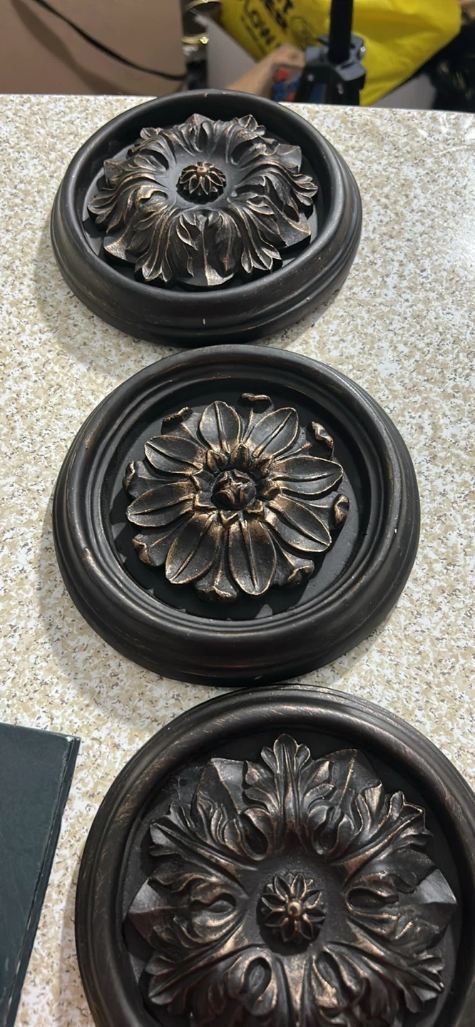 Selling a set of three decorative wall medallions. They have a bronze and black finish with a floral design. Perfect for adding a touch of elegance to any room!