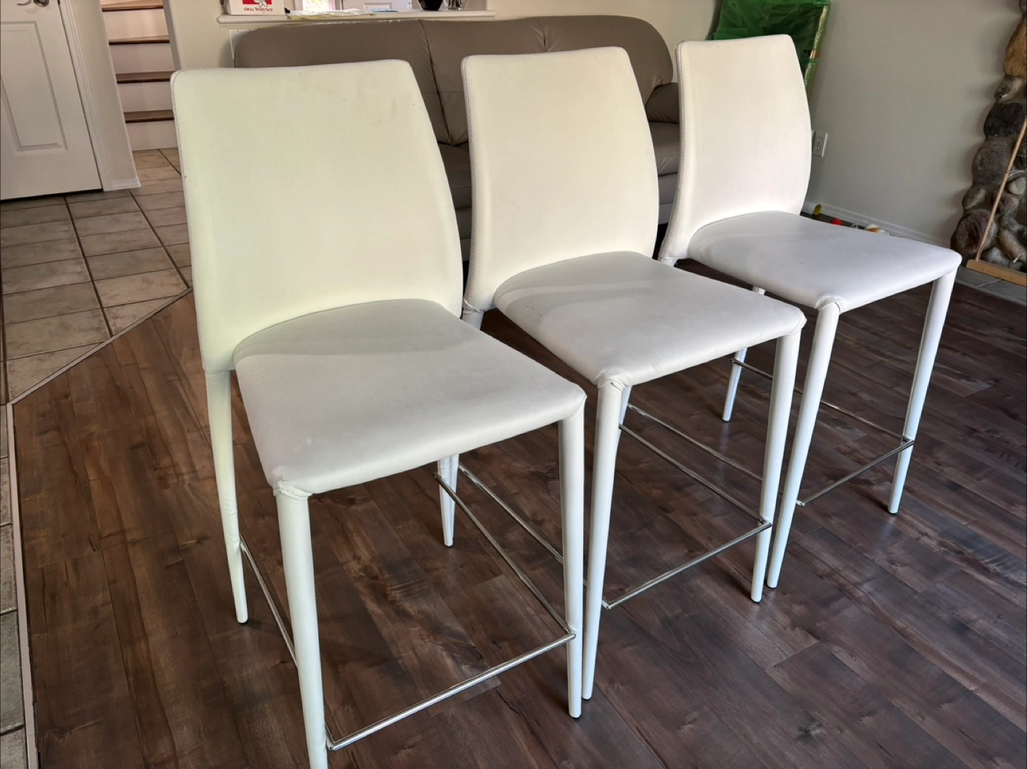 10Selling a set of three bar stools. They have been well used but are in good condition. The stools measure approximately 100cm in total height and the seat is 65cm off the floor. They would look great in any kitchen or bar area.