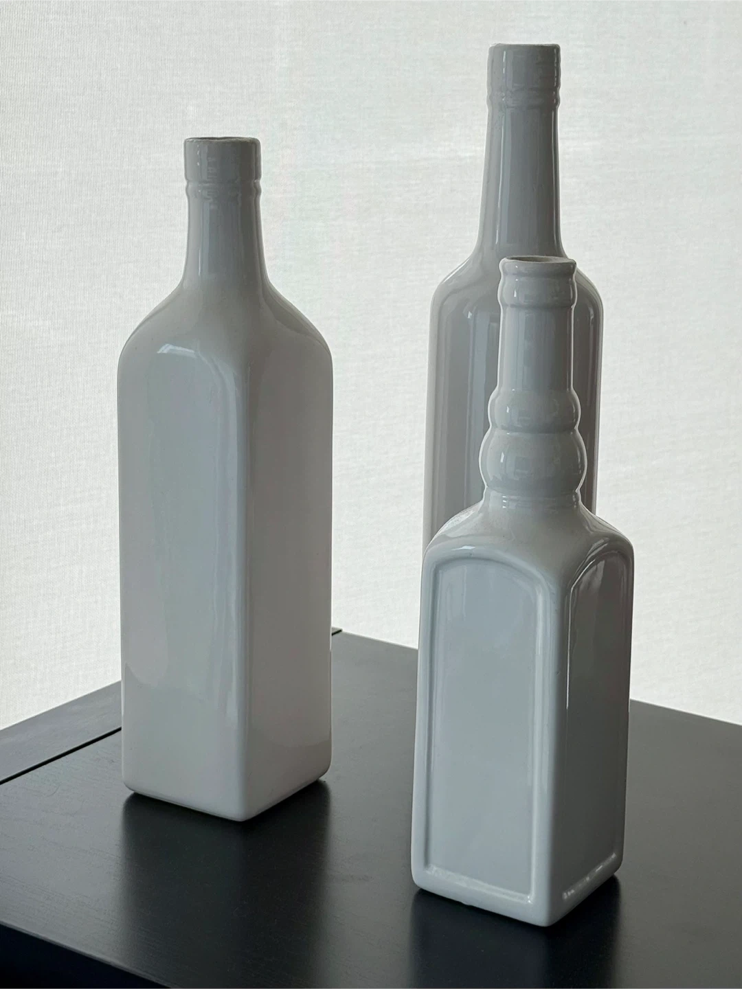 Selling a set of three decorative ceramic bottles in white. They would look great as a centrepiece or on a shelf. Purchased from Urban Barn. The rang in height from 12” to 14.5” (width average is 3”).