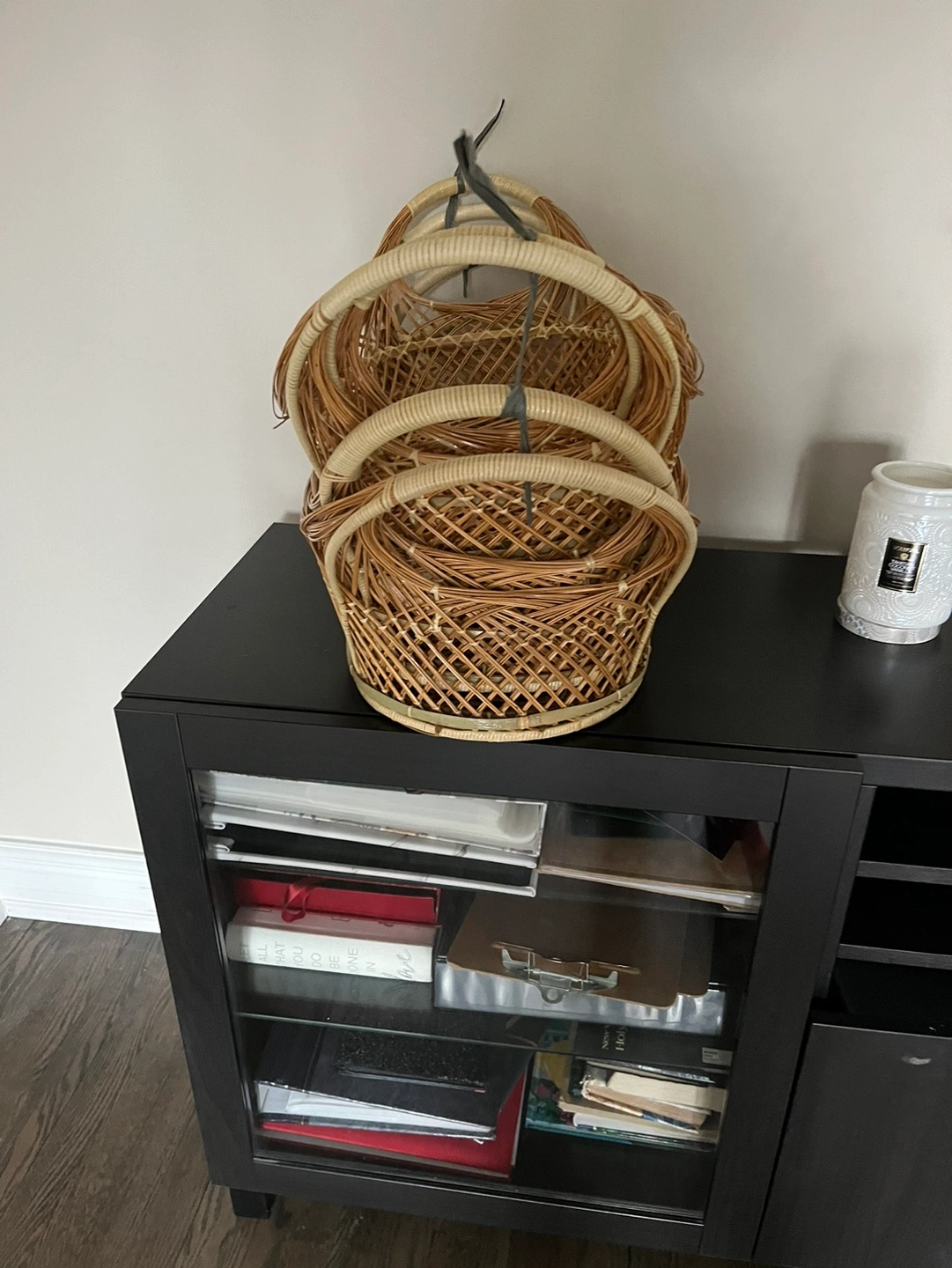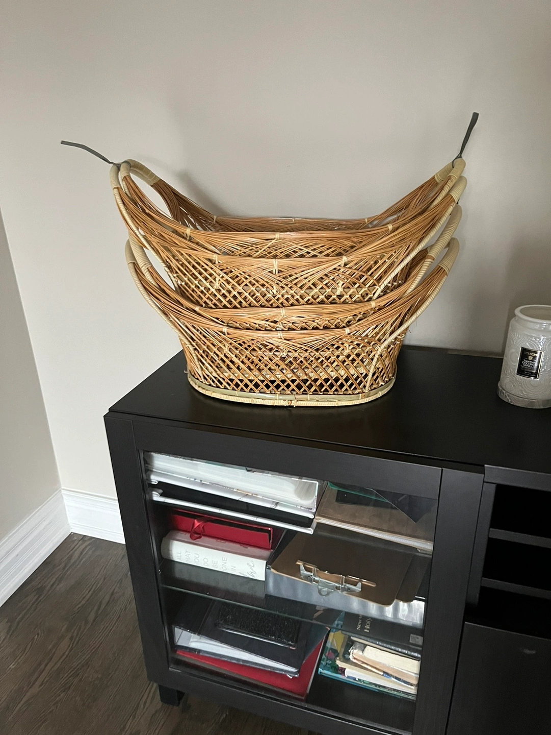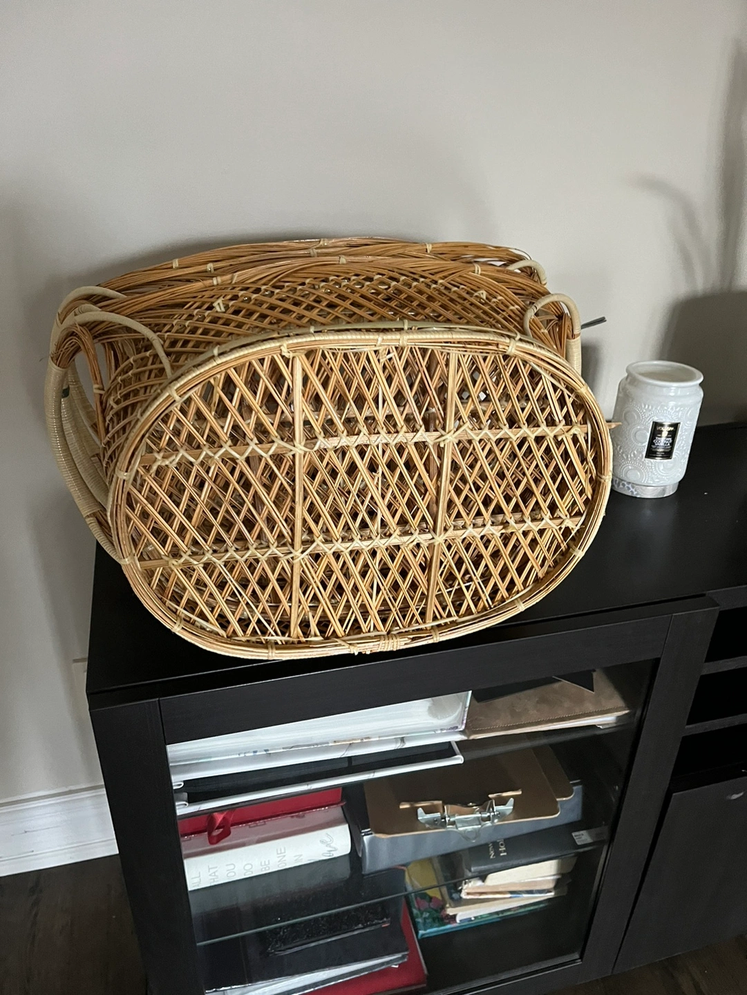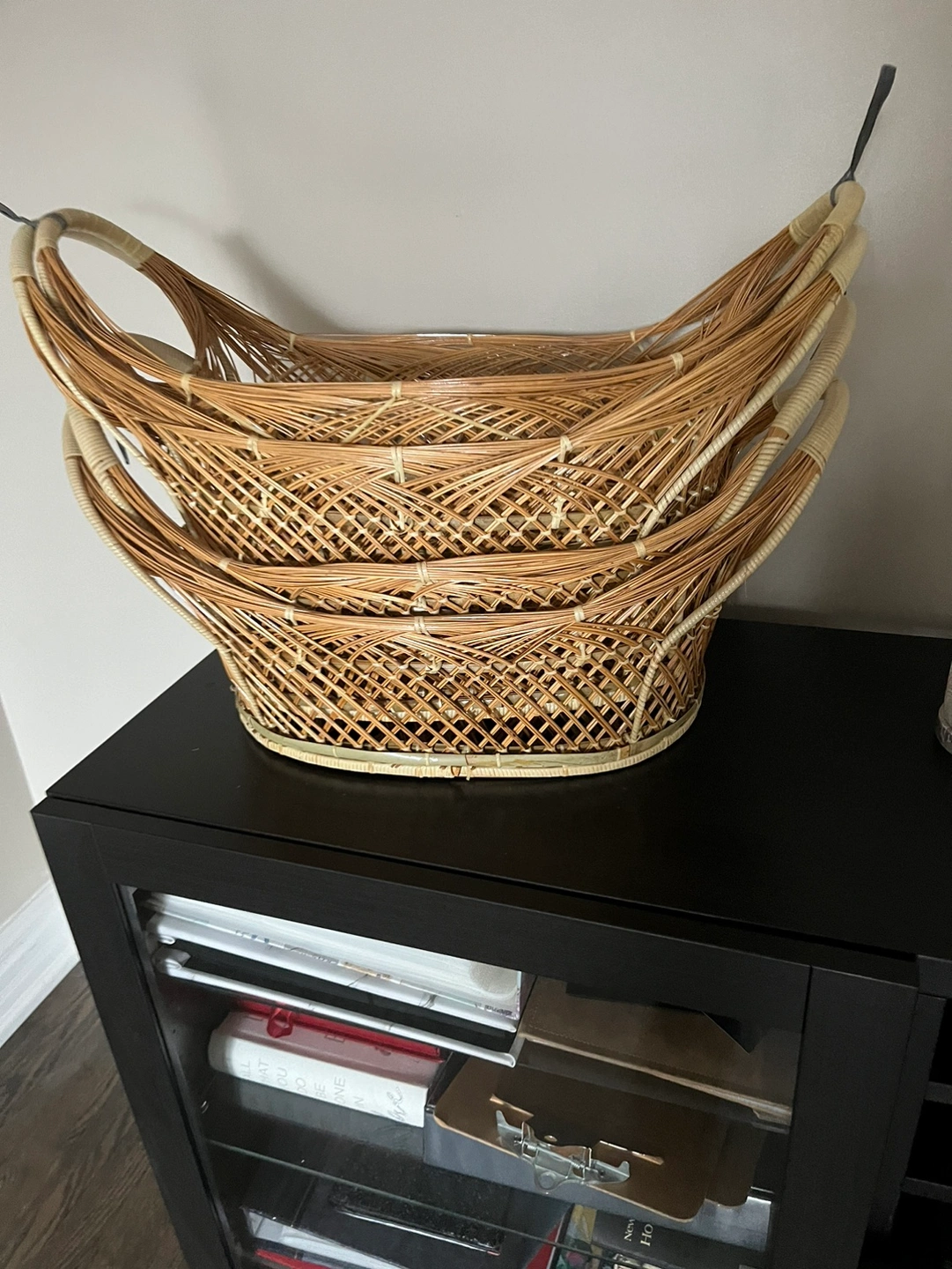 68Set of 3 wicker baskets with handles. Oval shaped.all 4 for$20 dollars