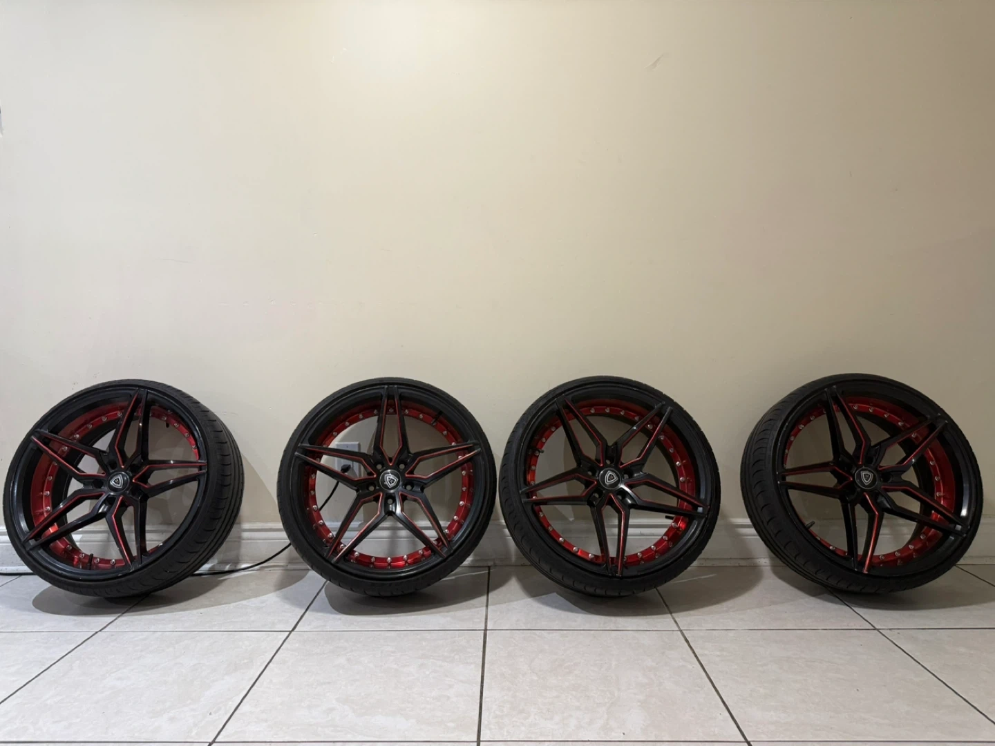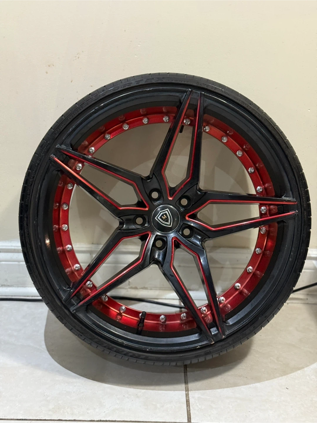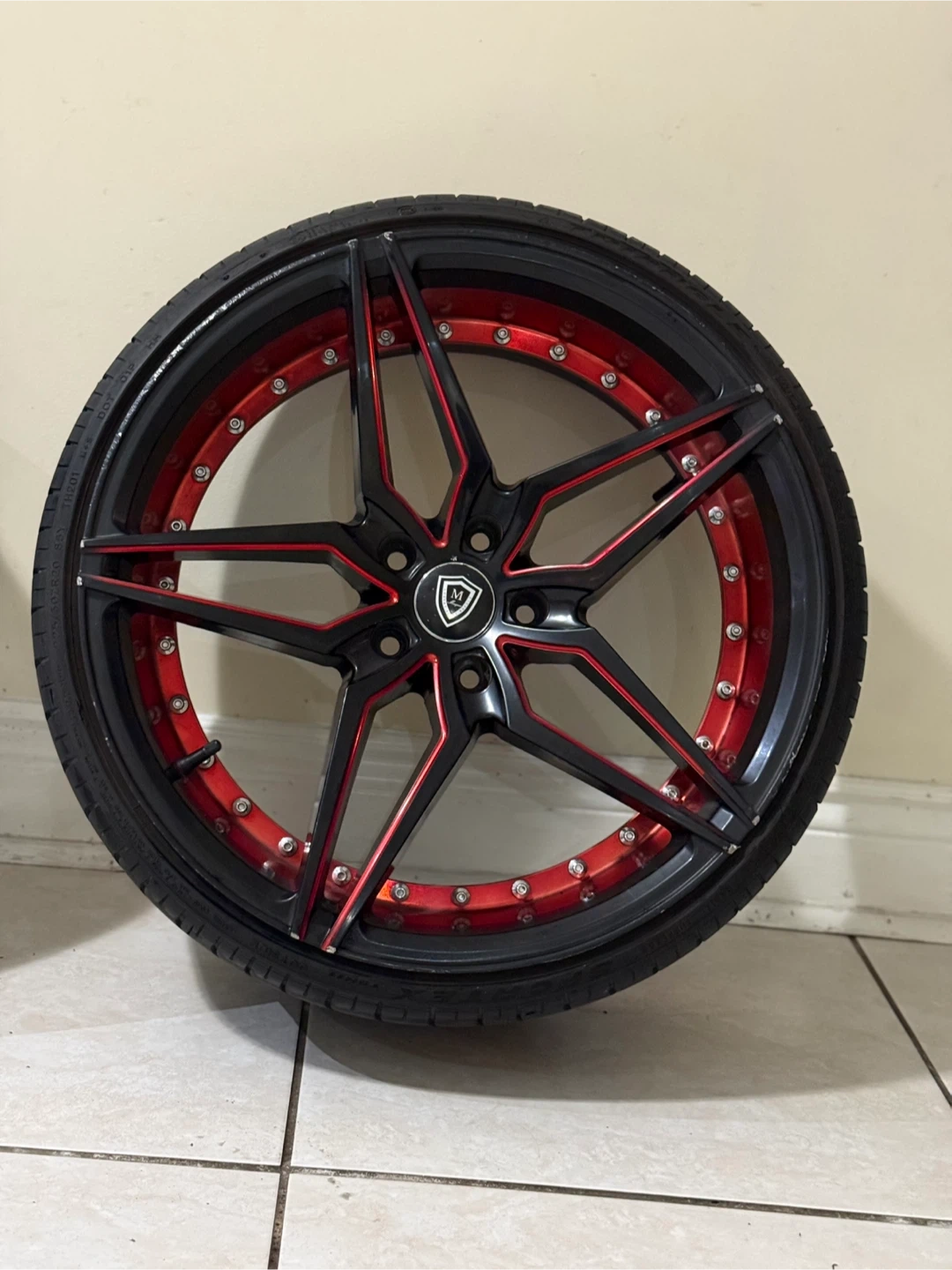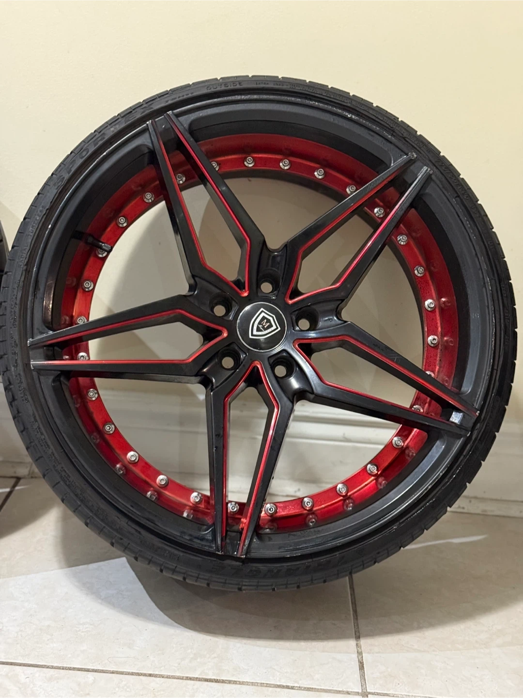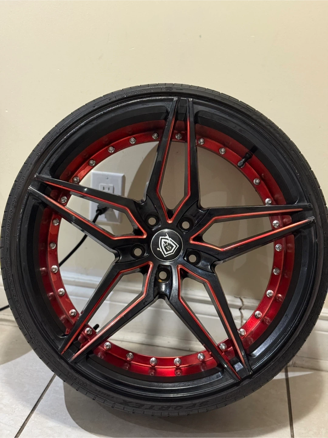 Selling a set of four aftermarket 20 inch rims. They feature a striking black and red design that will add a sporty look to your vehicle. They appear to be in good condition and ready to be installed.