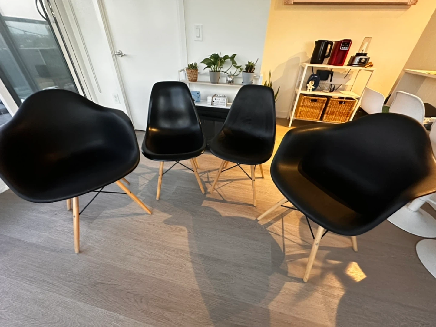 Selling a set of four Eames style chairs. They're in great shape and would look fantastic in any dining room or office space. The chairs are black with wooden legs, a classic design that's both stylish and comfortable! This purchase, along with the other items I’m selling here, will go toward my dog’s surgery. Thank you so much for your kindness and support 🙏🐶