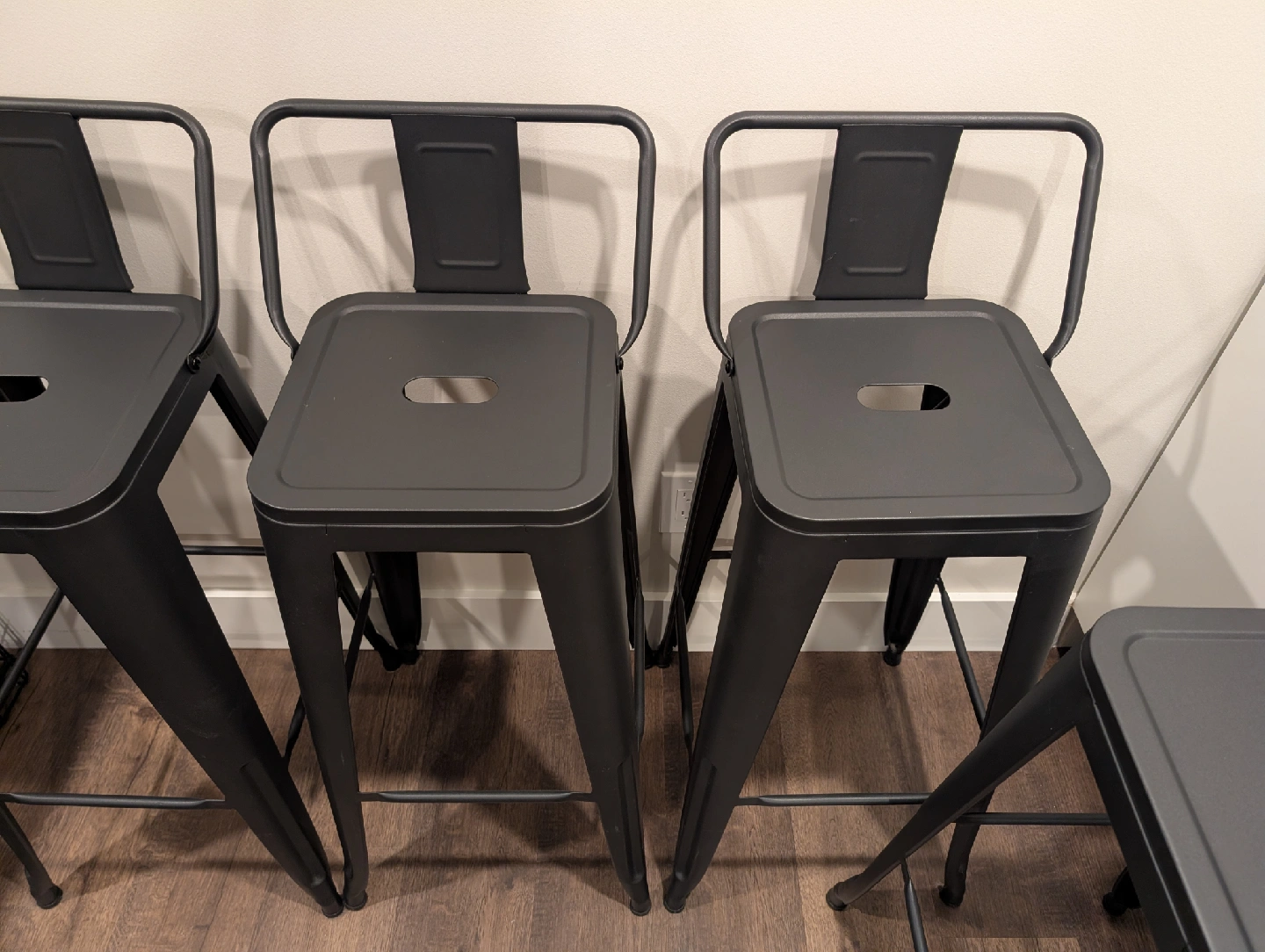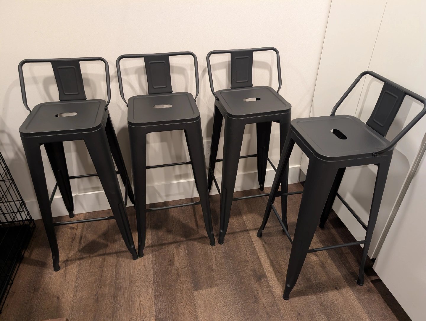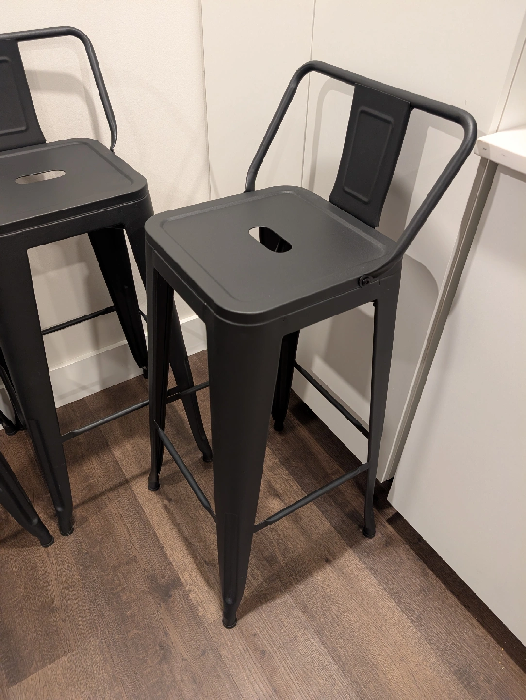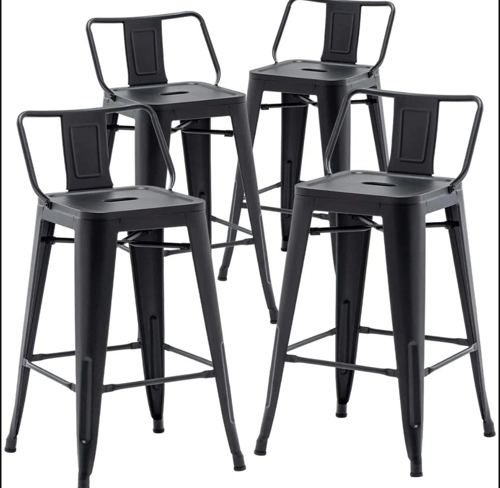 10Set of 4 metal barstools! Basically brand new. I have had them for about a year, but we want to change our decor up. They've been sitting around a table we never use. Very versatile and easy to keep clean. Black metal. Dimensions: Overall: 33" H (including back of the stool) x 15.7" W x 15.7" D Floor to seat is 30". These are not counter height, they are barstool height, so before purchasing ensure you measure your counter to floor height. Rust resistant and scratch resistant Weight capacity is 330lbs Paid close to $400 for 4 of these. Price is fair as they are basically new and in excellent condition. Do not message me "is this still available" I will not respond. If the postings up, it's available unless stated otherwise. ****Pick up only**** Pet friendly home