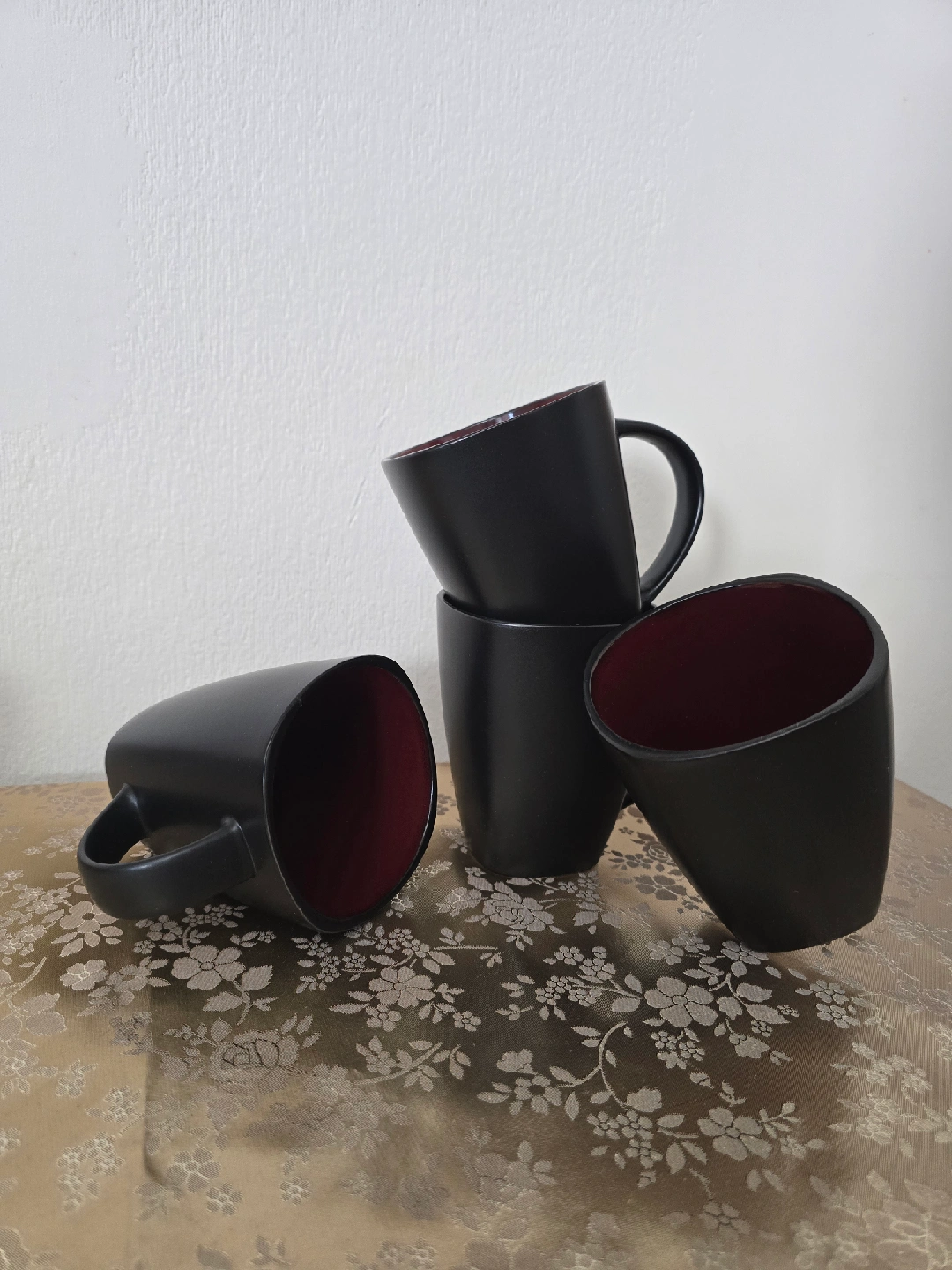 10Selling a set of 4 mugs. They are black on the outside with a red interior. Great for coffee, tea, or any beverage!