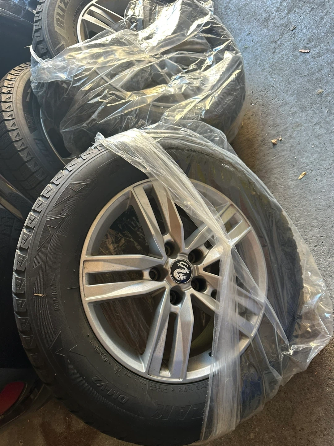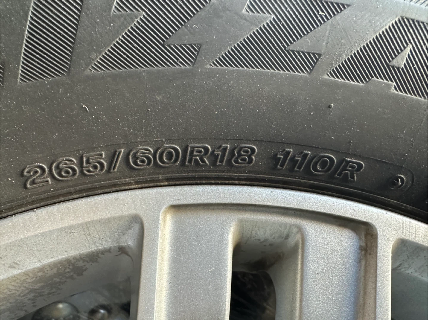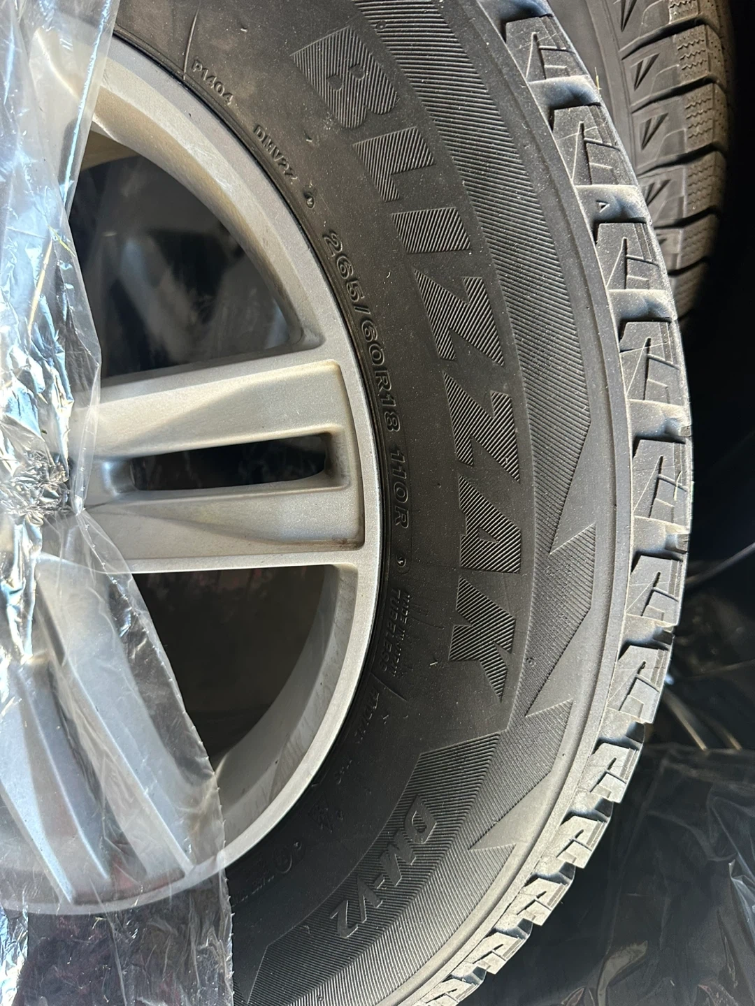 Selling a set of four Blizzak DM-V2 winter tires and rims . The size is 265/60R18 110R. They are in good condition and ready for the winter season! DAI Alloy rims. 265/60 R18 110T rated. Bolt pattern 5X127 mm Lug nuts included TPMS sensors . NOTE: Refer to photo, one tire has a screw in it ! Price is negotiable .