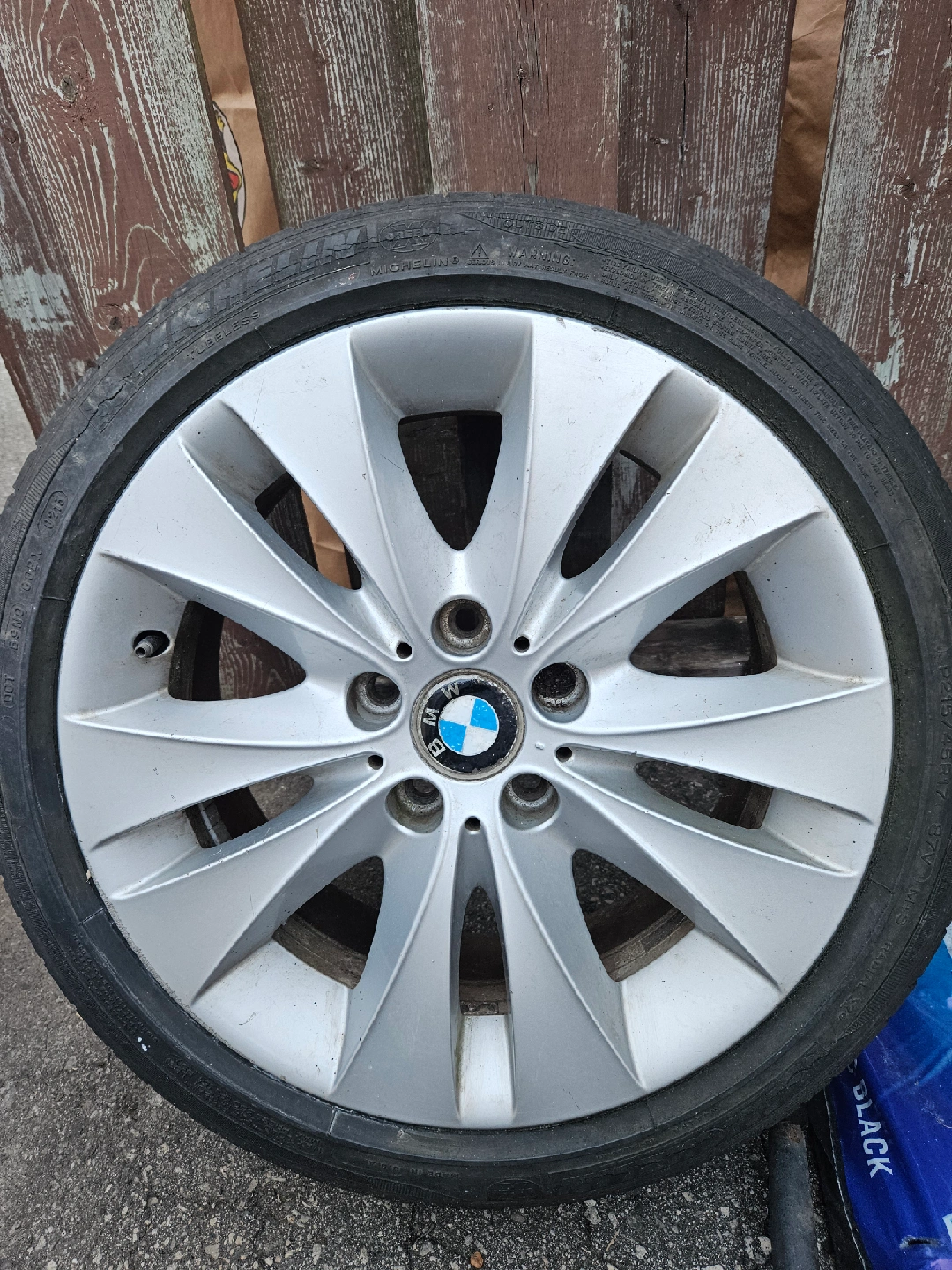 Selling a set of BMW wheels. The wheel is silver and has the BMW logo in the centre.