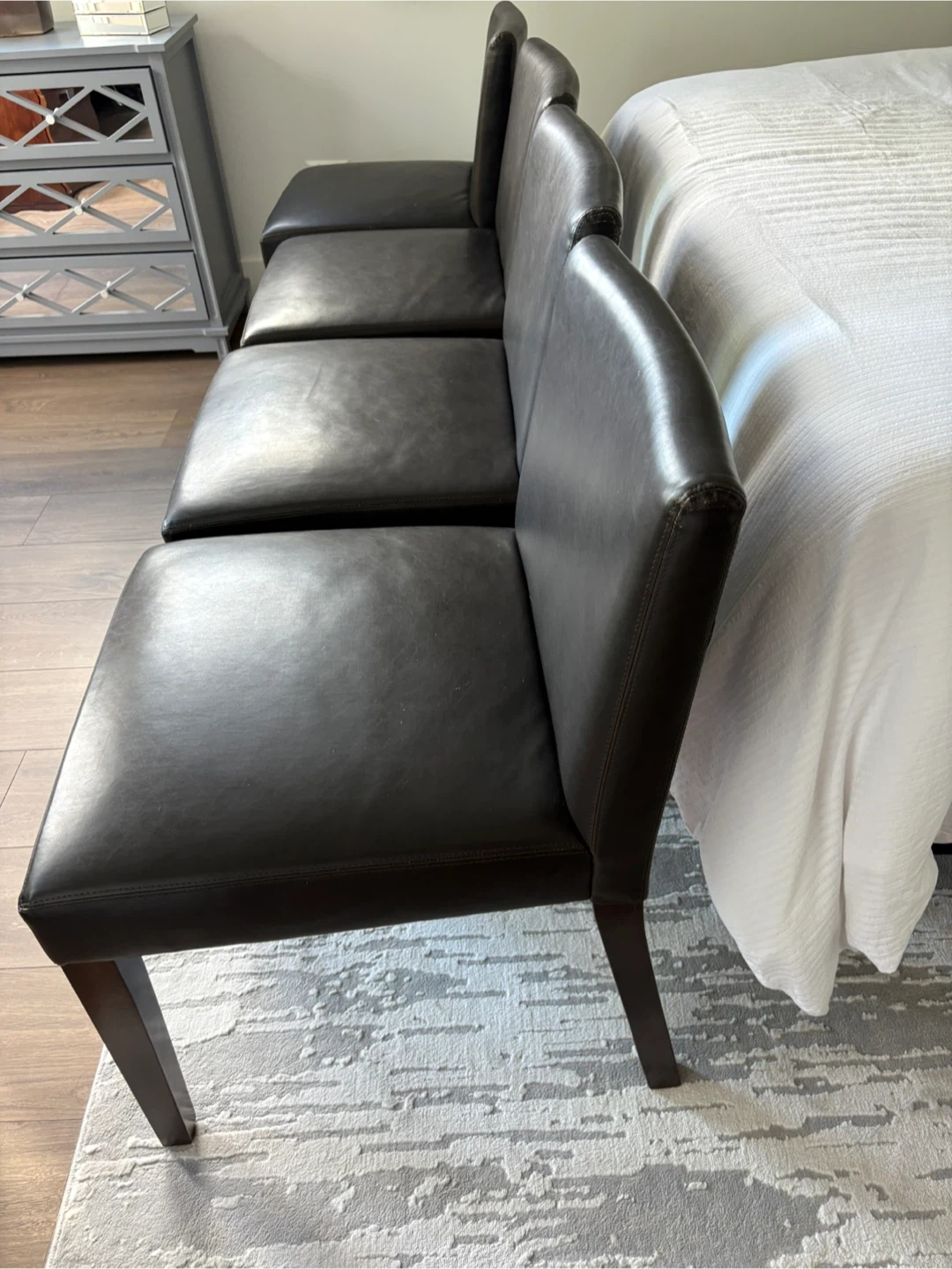 10Selling a set of 4 dining chairs. They are brown leather with dark brown wooden legs. The chairs measure approximately 49 cm wide, 75 cm tall, with the seat being 44 cm wide and 38 cm deep. They are in good condition and would be a great addition to your dining room