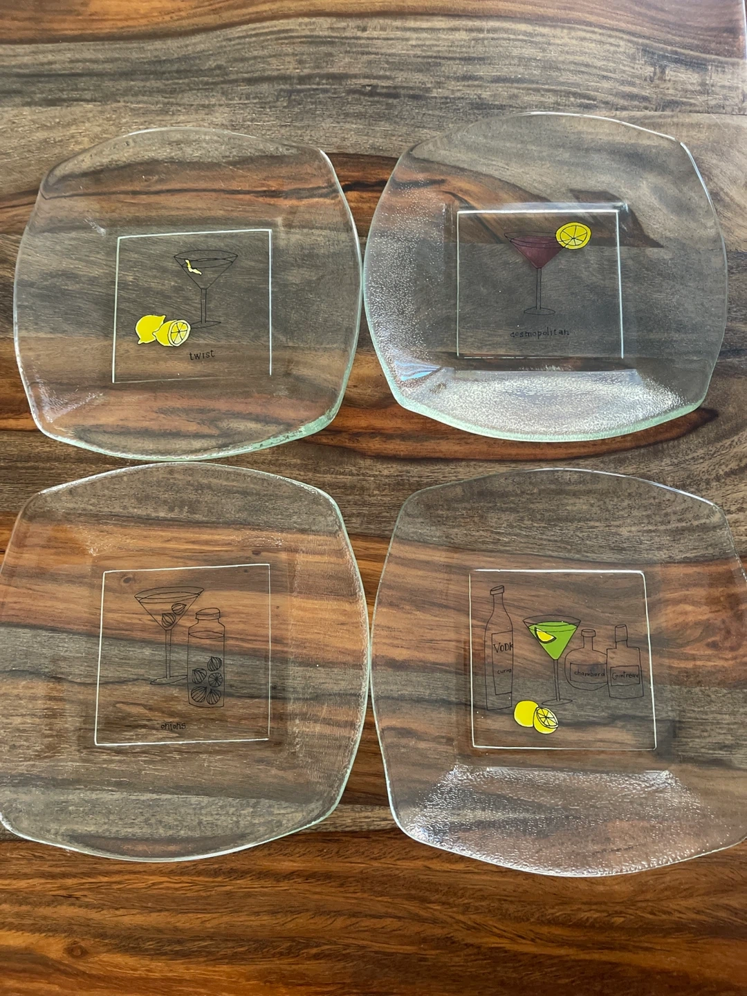 44Selling a set of four appetizer plates, each featuring a different cocktail glass design. They're perfect for serving snacks or appetizers at your next gathering! The plates are clear glass with fun, colourful cocktail illustrations. *New without box
