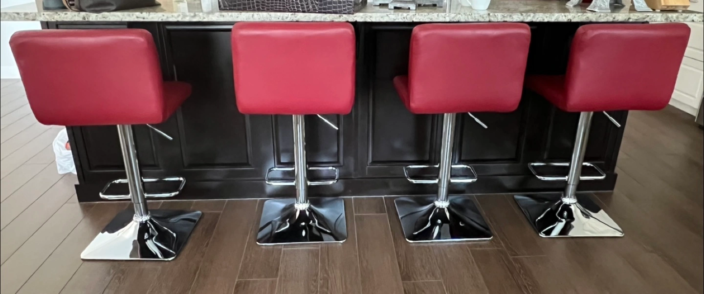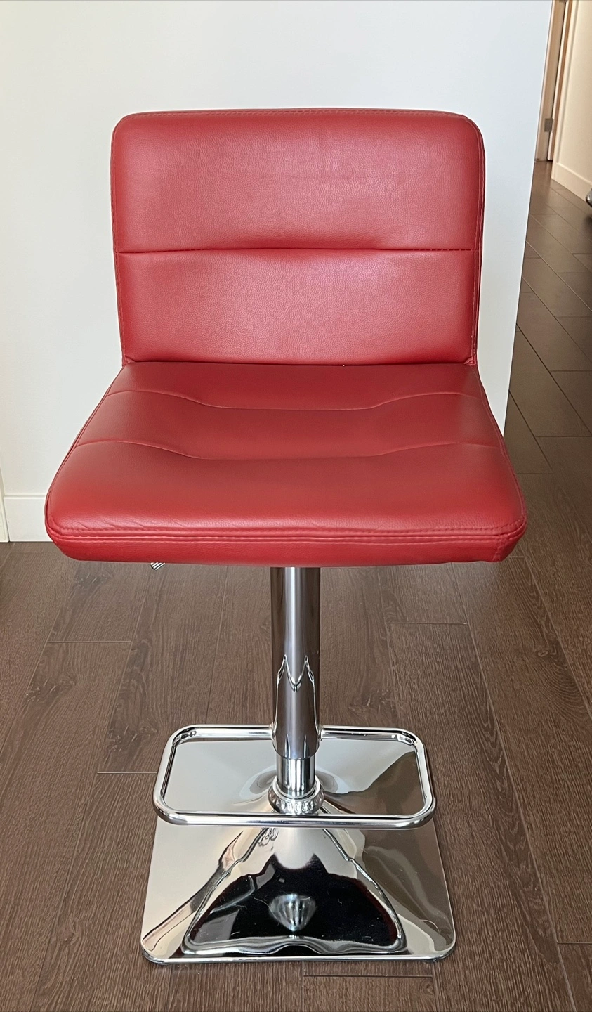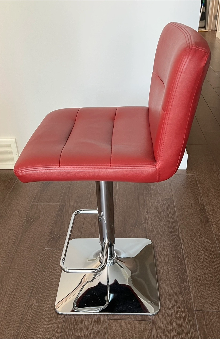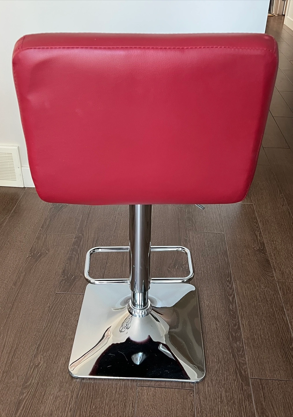 39Add a pop of colour to your kitchen or bar with this set of 4 red faux leather adjustable (hydraulic) counter bar stools with chrome bases. All 4 stools are in excellent condition (no tears or stains) and are ready for a new home! Estate sale. Paid retail for the set: $500. Asking $200 Minimum seat height (not including back): 24” Maximum seat height (not including back): 33” Seat back: 12”