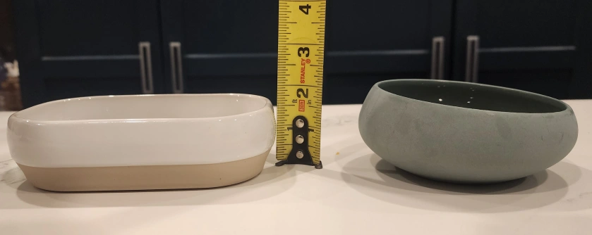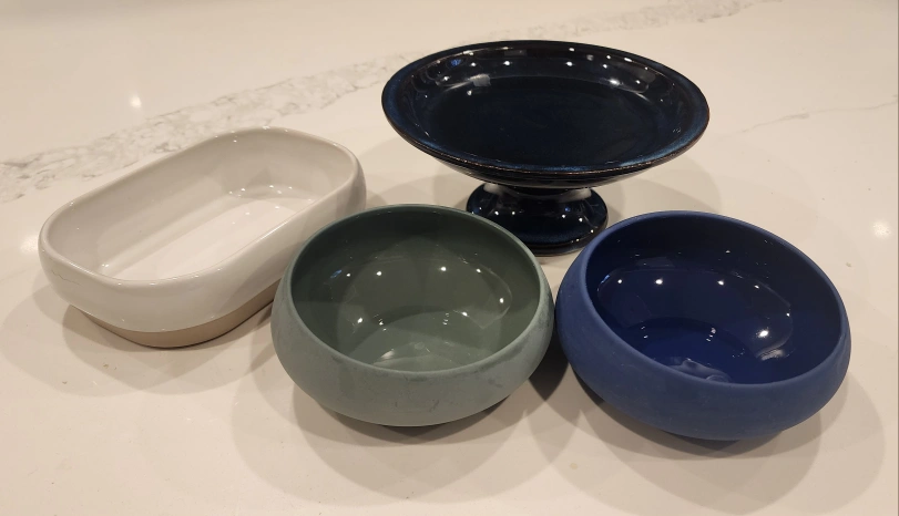 Selling a set of four decorative bowls in various shapes and colours! Includes a 6.5" w x 3" tall cupcake stand, 6" x 4" x 1.75" white rectangle, and two 4.5" wide x 2" high side (1.5" low side) bowls. 3 dishes are Degrenne Gres brand