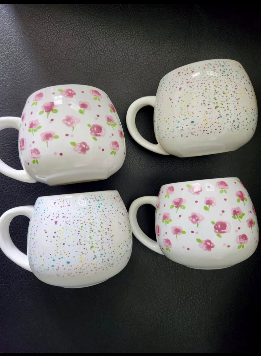 I'm selling a set of four mugs. Two have a lovely floral pattern with pink flowers, and the other two have a fun speckled design with various colours. Perfect for adding a touch of charm to your morning coffee or tea!