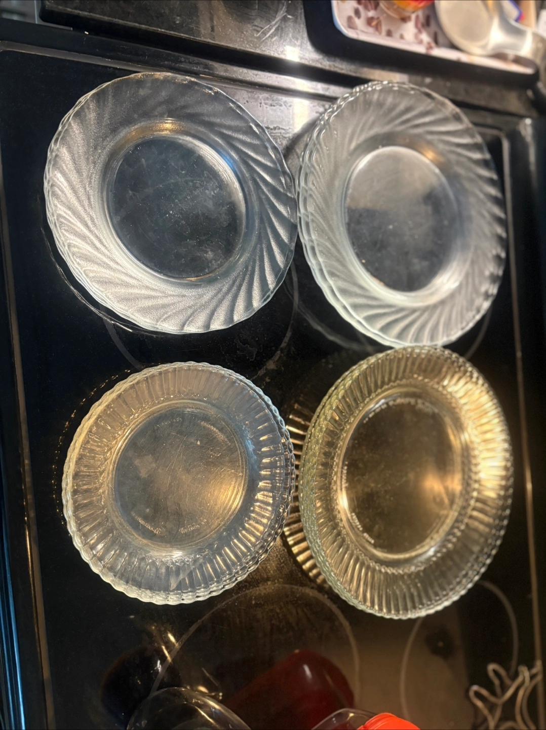 40Selling a set of 4 glass plates. They have a lovely, delicate design around the edges and are in good condition. Perfect for everyday use or special occasions!