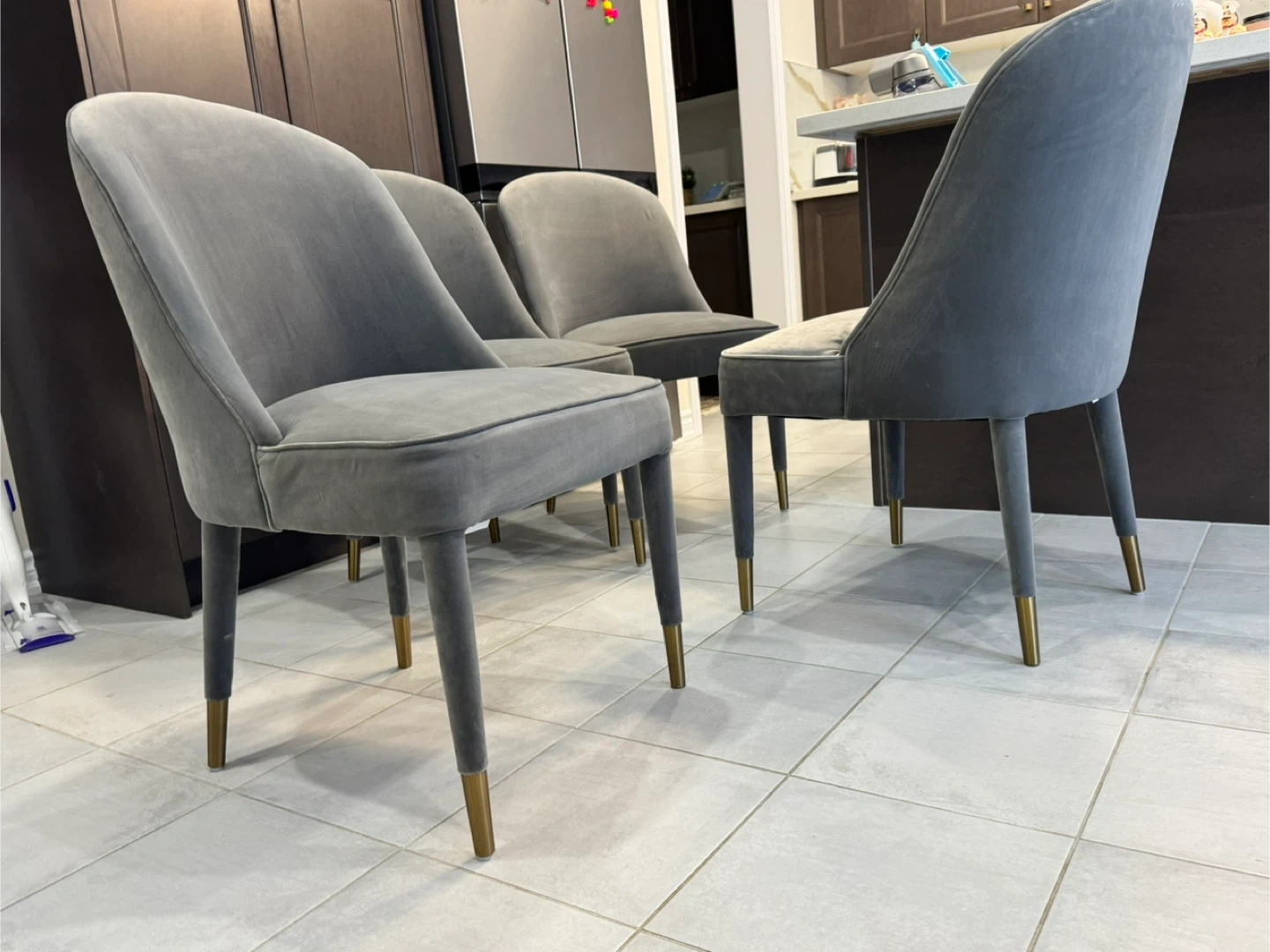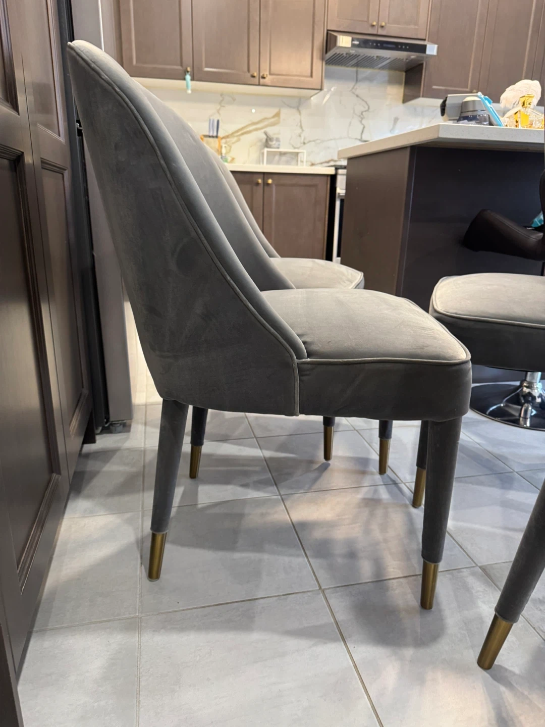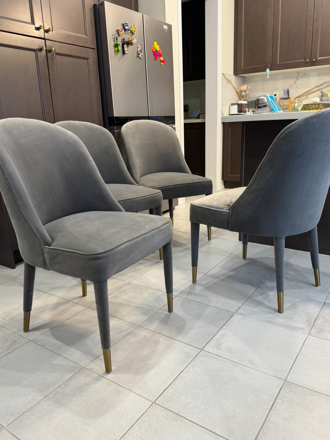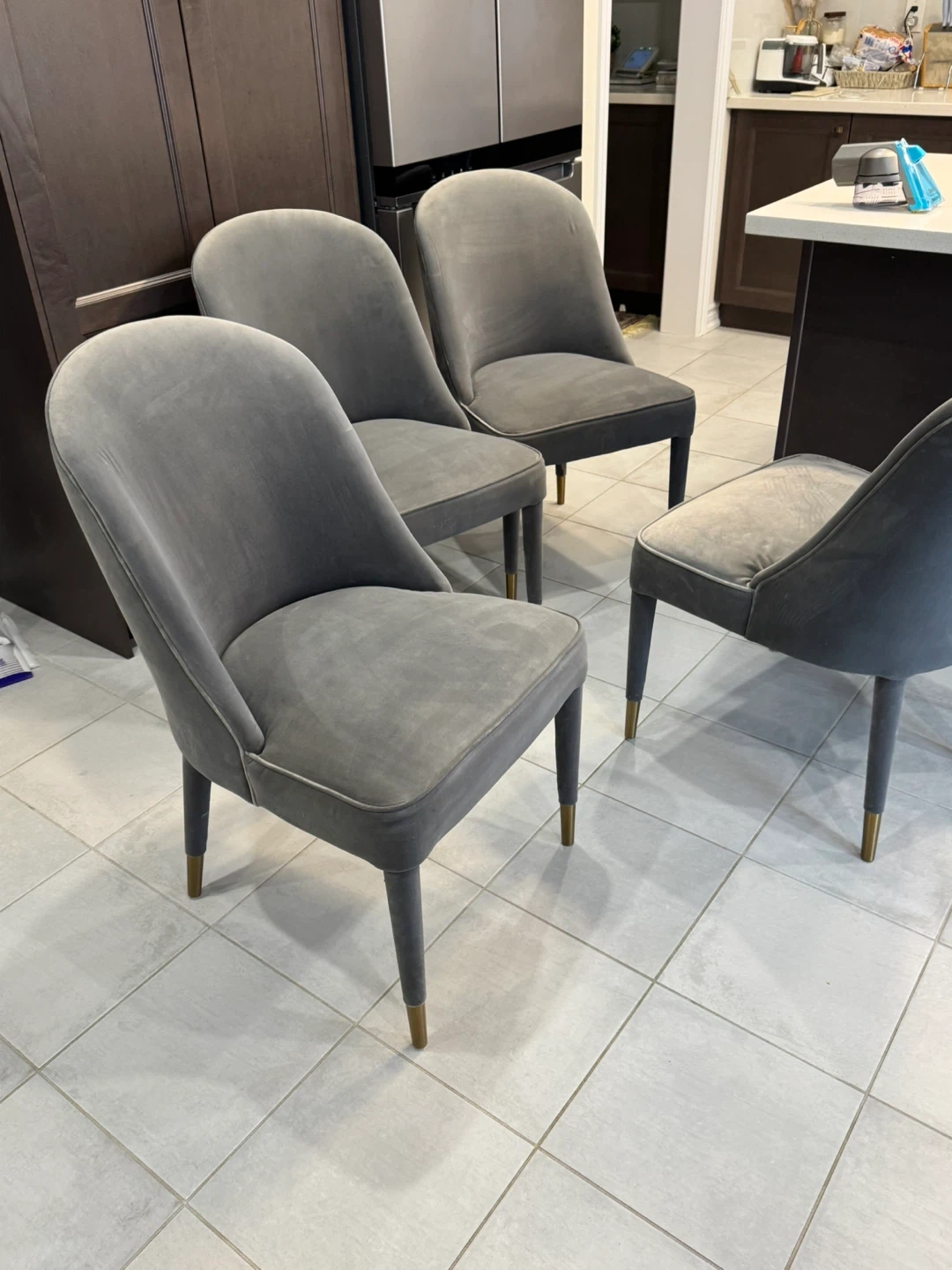 10For Sale: Set of 4 Velvet Chairs Elegant grey velvet chairs with gold-tipped legs. Originally $199 each (plus tax), selling all 4 chairs for $290 total – quick sale! -Used condition, cleaned to the best of my ability -No rips, holes, or major damage – overall solid and presentable -Stylish and comfortable – perfect for dining, office, or as accent chairs -From a pet-free and smoke-free home Pick up : oshswa