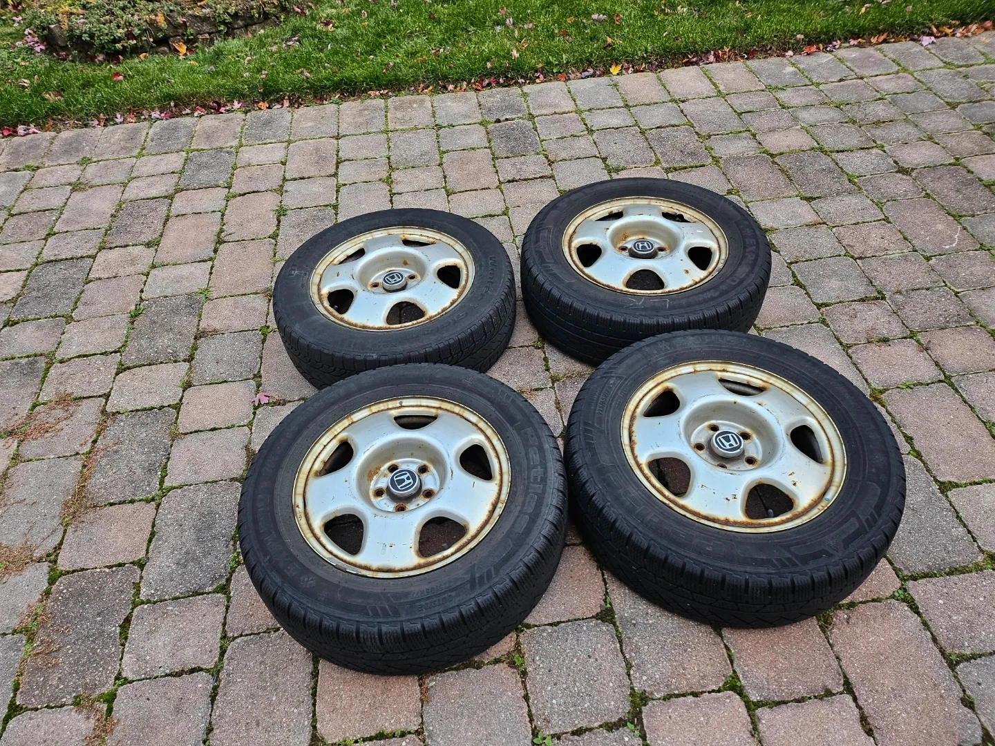 60Selling a set of four wheels and tires, originally from a Honda. They show some signs of use, but are still in good condition for their age. Perfect for winter tires or as a spare set!
