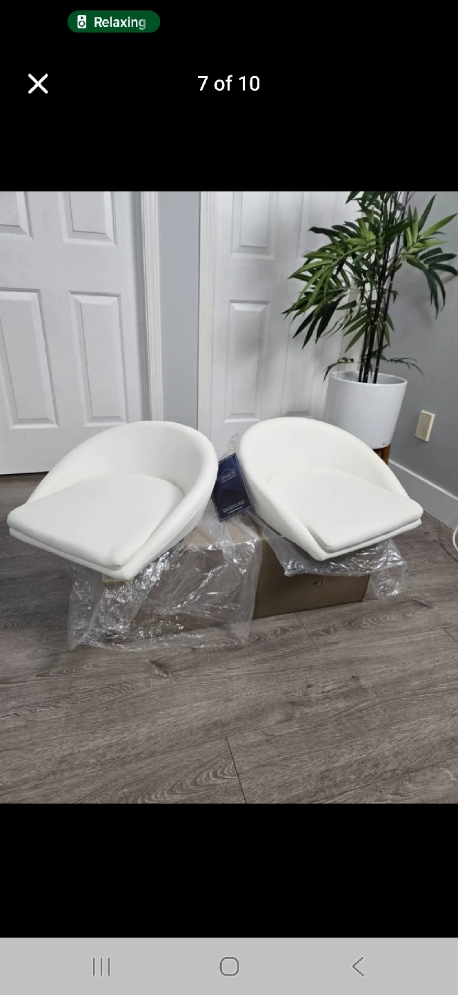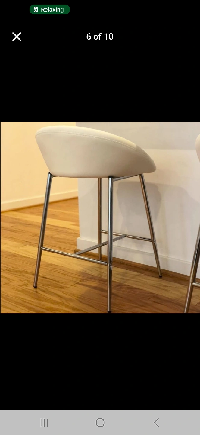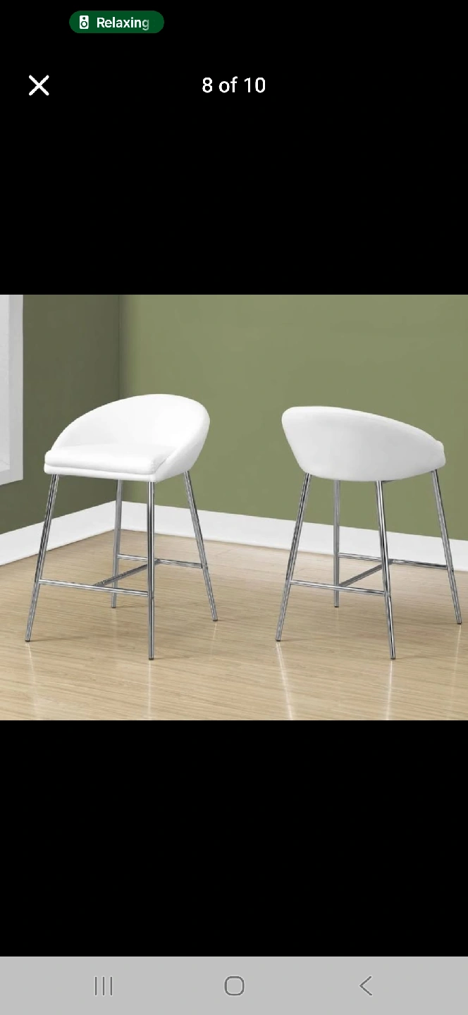 Set of 4 new in box white modern contemporary counter stools. Seat height is 24". Sleek look with white faux leather rounded seats and silver chrome legs. Minor cosmetic imperfections, both pictured. Priced accordingly. $430 firm for the set of 4. Pickup in New West near 22nd Street Skytrain Station. New in box, unassembled. Box opened for photos only. Dimensions: 20.5"D x 20.5"W x 29.75"H
