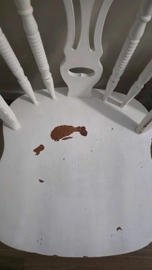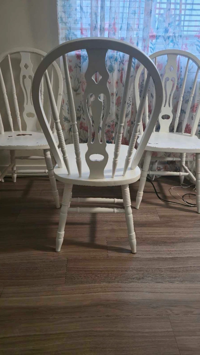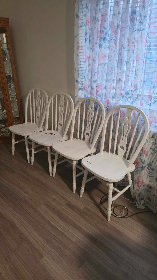 10Set of 4 solid wood dining chairs in sturdy condition. Painted white with a charming, distressed look — some areas of paint wear as shown in photos. These chairs can easily be stripped or sanded to reveal the natural wood underneath, perfect for refinishing, farmhouse, shabby chic, or DIY projects. Solid wood construction Comfortable curved back design Great for kitchen, dining room, or cottage decor $50 for the full set of 4, non negotiable. Pickup only.