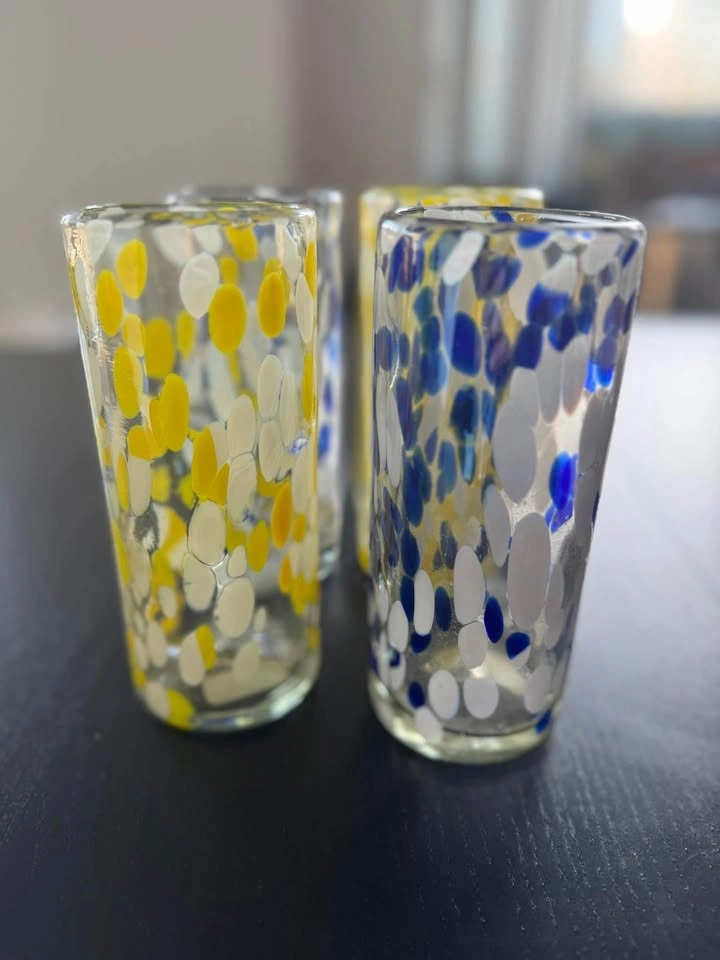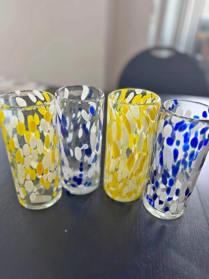 76Each glass has a unique speckled design in vibrant blue, yellow, and white — perfect for cocktails, juice, or sparkling water. 4 tall glasses (never really used) Beautiful modern design No chips or cracks Smoke-free, pet-free home Asking $20 cash for all 4 Pickup only near Lower Sherbourne and Queens Quay E.